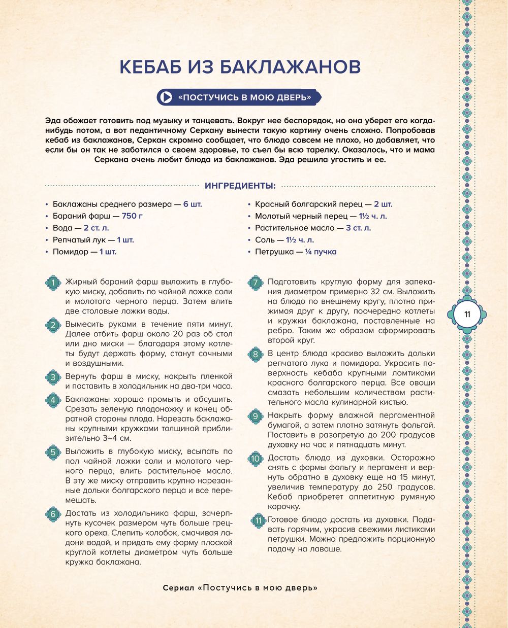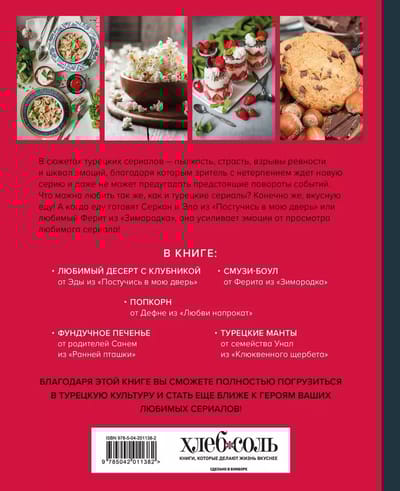 Īstiem turku seriālu cienītājiem! Šīs grāmatas lappusēs jūs atradīsiet soli pa solim receptes ēdieniem, kas parādījās jūsu iecienītāko seriālu sērijās: “Knock pie manām durvīm”, “Īres mīlestība”, “Early Bird” un daudzās citās! Ļaujiet gatavošanas procesam sagādāt jums prieku un sajust turku virtuves gaisotni, un ļaujiet ēdieniem izrādīties tik garšīgi, ka jums un jūsu mīļajiem tā vien gribēsies teikt: “Chok leczetli!”