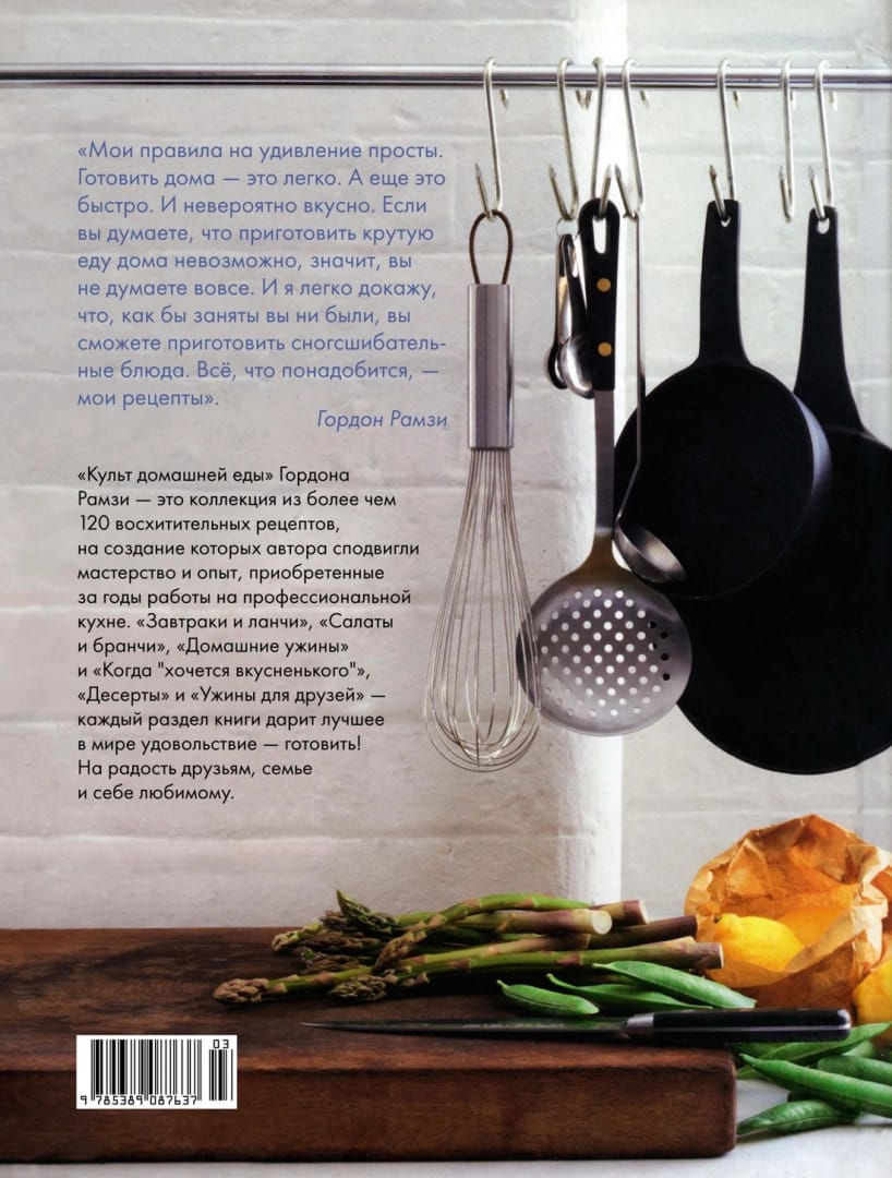 Gordona Ramsija grāmata "Mājas pavārmākslas kults" ir vairāk nekā 120 garšīgu jaunu recepšu kolekcija, ko iedvesmojušas prasmes un pieredze, kas gūta, gadiem strādājot profesionālās virtuvēs. "Brokastis un pusdienas", "Salāti un vēlās brokastis", "Mājas vakariņas" un "Kad gribas mazliet garšīgi", "Deserti" un "Vakariņas draugiem" - katra grāmatas sadaļa sniedz vislabāko prieku pasaulē - gatavot - draugu, ģimenes un sevis priekam. Gordons Ramsijs ir slavens britu šefpavārs, seriāla Hell's Kitchen zvaigzne un kulinārijas bestselleru autors.