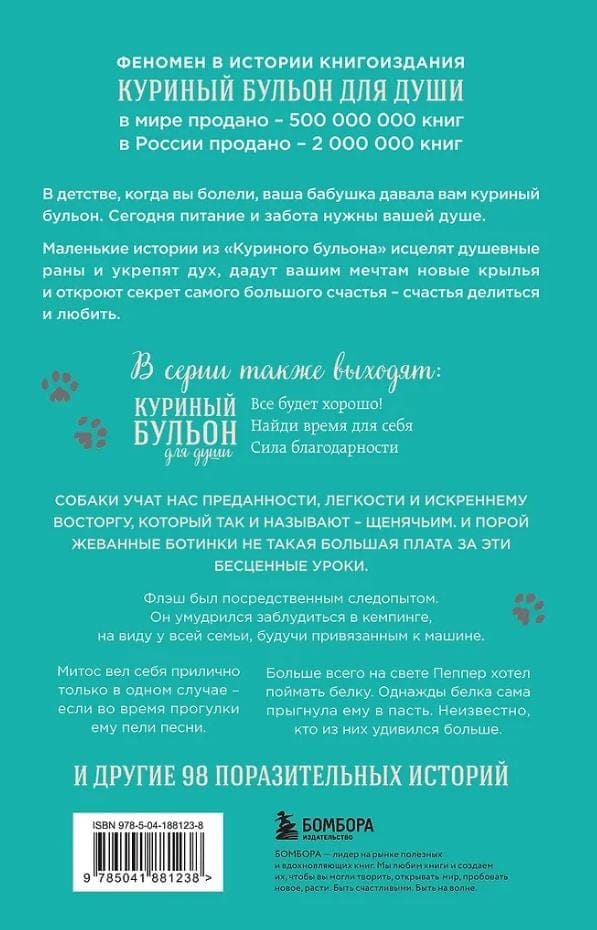 Jaunajā grāmatā sērijā “Vistas zupa dvēselei” iekļauti smieklīgi un aizkustinoši stāsti par visuzticamākajiem astainajiem kompanjoniem — suņiem. Suņi māca mums lojalitāti, vieglumu un patiesu prieku, ko sauc par kucēnu prieku. Un dažreiz apgrauztas kurpes nav tik liela cena par šīm nenovērtējamajām mācībām.