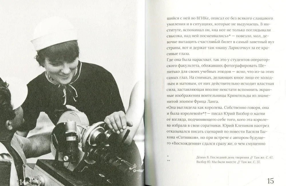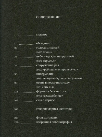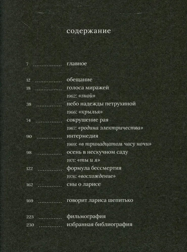 Larisas Šepitko (1938-1979) karjera tika pārtraukta pašā mūža plaukumā. Taču ar četrām spēlfilmām pietika, lai viņa iekļūtu krievu un pasaules kino klasikas panteonā. Šajā grāmatā no sērijas "Seansi. Sejas" kinovēsturnieks un režisors Oļegs Kovaļovs konsekventi stāsta par katru no Šepitko filmām (arī par īsromānu no kino almanaha "Neredzamā laikmeta sākums" un mazpazīstamo Jaungada televīzijas izrādi "Trīspadsmitajā nakts stundā") un sniedz oriģinālas viņas darbu interpretācijas. Grāmatu papildina Šepitko interviju un runu apkopojums.