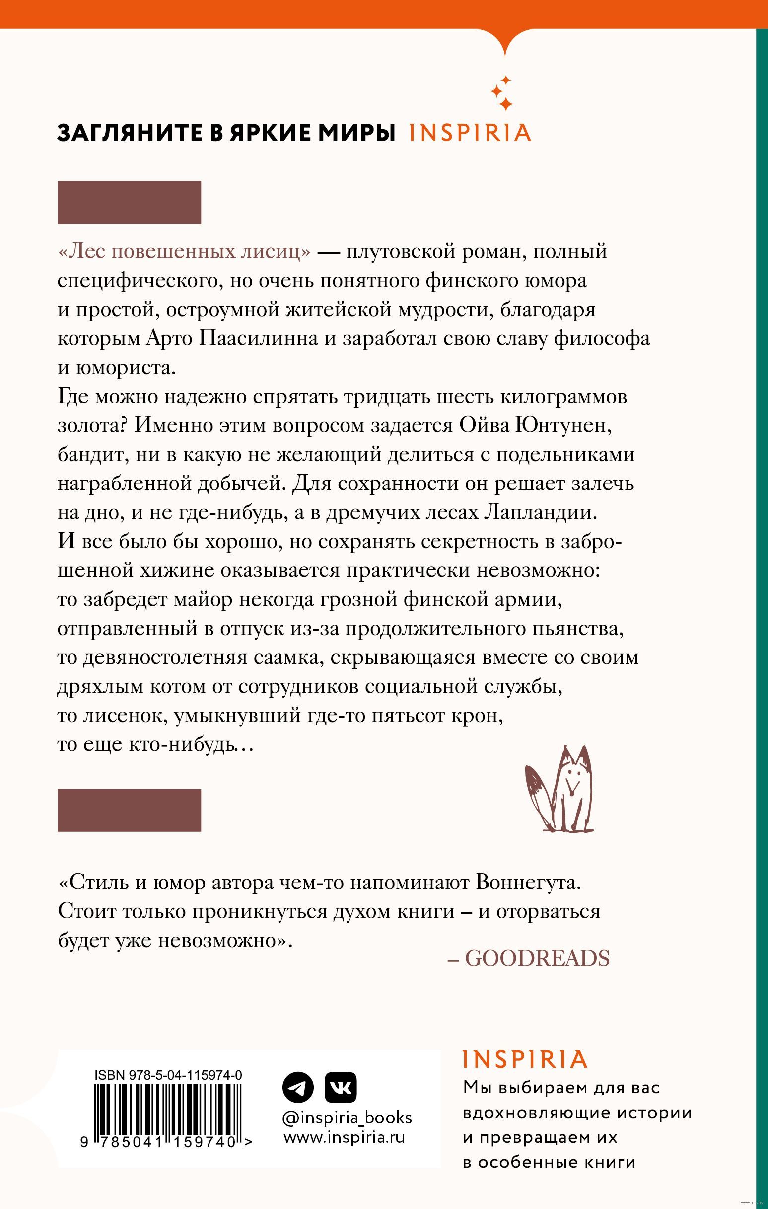 Arto Paasilinnas romāni, kas sarakstīti spilgtā valodā, absurda un realitātes krustpunktā, ir kļuvuši par nozīmīgu somu literatūras sastāvdaļu. Kas var apvienot zagli, somu armijas majoru un deviņdesmitgadīgu sievieti ar novecojušu kaķi mežonīgajos Lapzemes mežos? Katram no viņiem bija savi iemesli, kāpēc viņi tik tālu aizklīduši, bet kas zina, varbūt liktenis viņus nav nejauši savedis kopā? "Pakārto lapsu mežs" - kņadas romāns, pilns specifiska, bet ļoti saprotama somu humora un vienkāršas, asprātīgas dzīves gudrības, pateicoties kurai Arto Paasilinna un izpelnījies savu filozofa un humorista slavu.