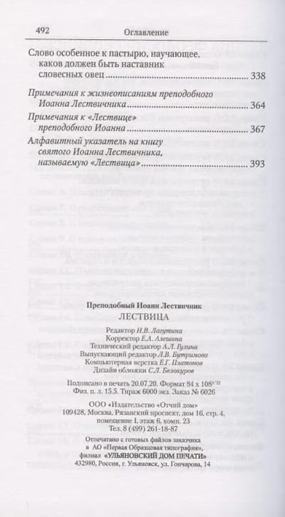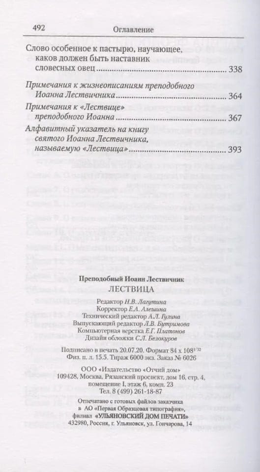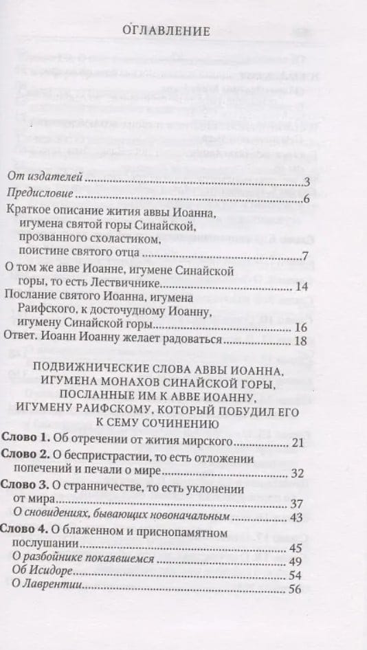 Lestvica, mūka Jāņa Cienījamā darbs, ir ceļvedis gan mūkiem, gan lajiem, lai paceltos gara augstumos. Šajā izdevumā, saglabājot tradicionālo teksta dalījumu "vārdos", papildus ir pievienoti norādījumi, kā lasīt "Lestvicu" gavēņa dienās. Piezīmju veidā iespiestās piezīmes malās atveido līdzīgus norādījumus baznīcas slāvu "Lestvicas" tekstam no Maskavas Teoloģijas akadēmijas bibliotēkas Seno rokrakstu nodaļas.