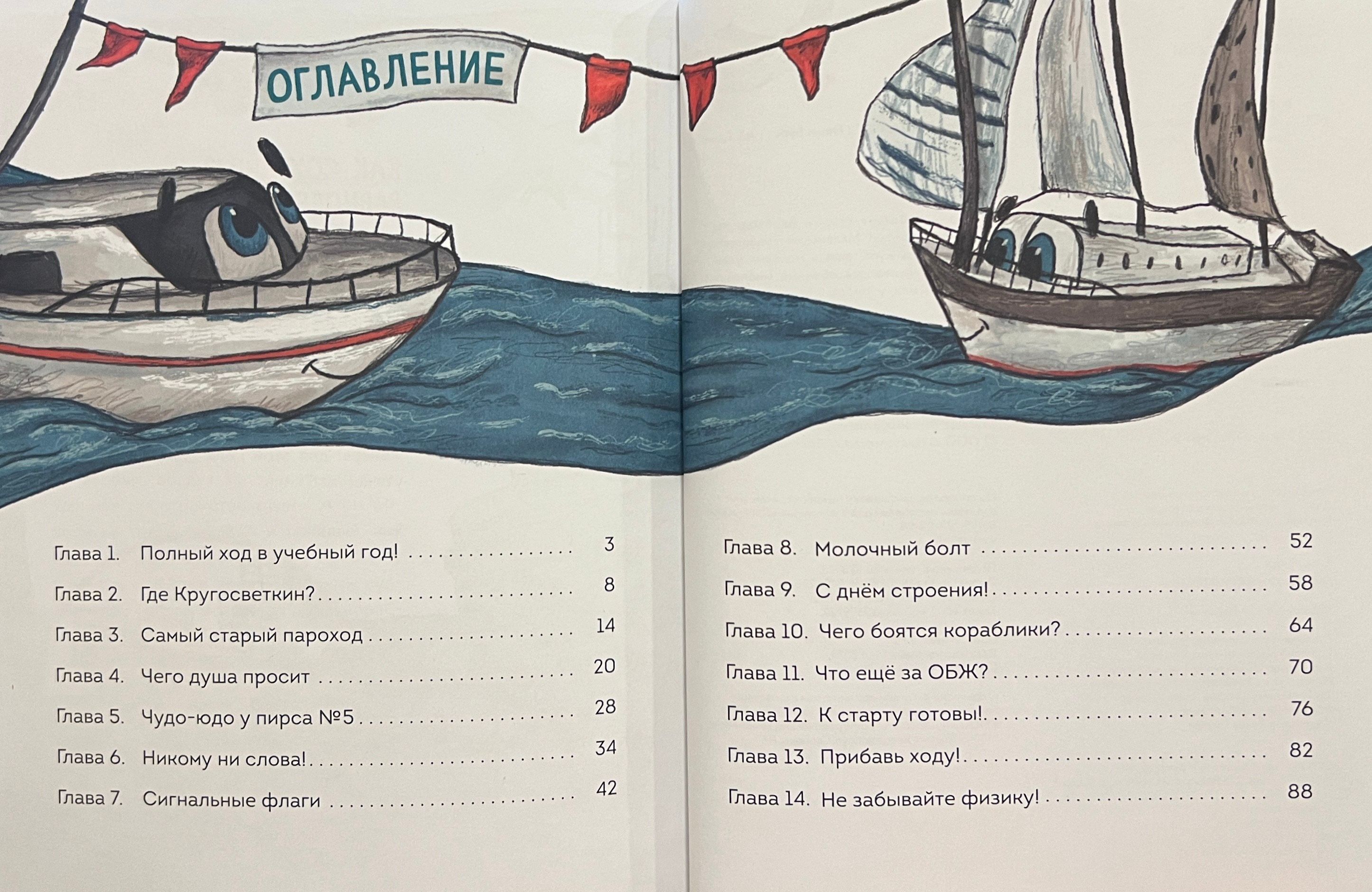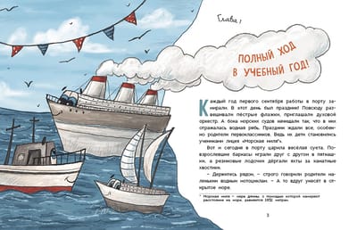Korvetes dodas arī uz skolu. Skolotājs tur ir vecs tvaikonis, nav rakstāmgaldu, bet ir piestātne Nr. 5, un tā vietā ir pirmklasa — Morzes alfabēts. Mazajiem kuģīšiem jāmācās signalizēt ar karodziņiem, noteikt kursu, sasiet jūras mezglus... Citādi viņu rūpes ir līdzīgas tām, ar kurām saskaras parastie skolēni. Jo nav svarīgi, kur bērni mācās — pie rakstāmgalda vai pie mola.