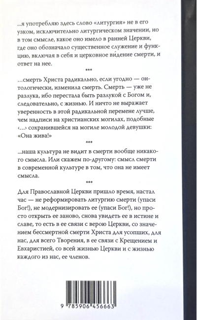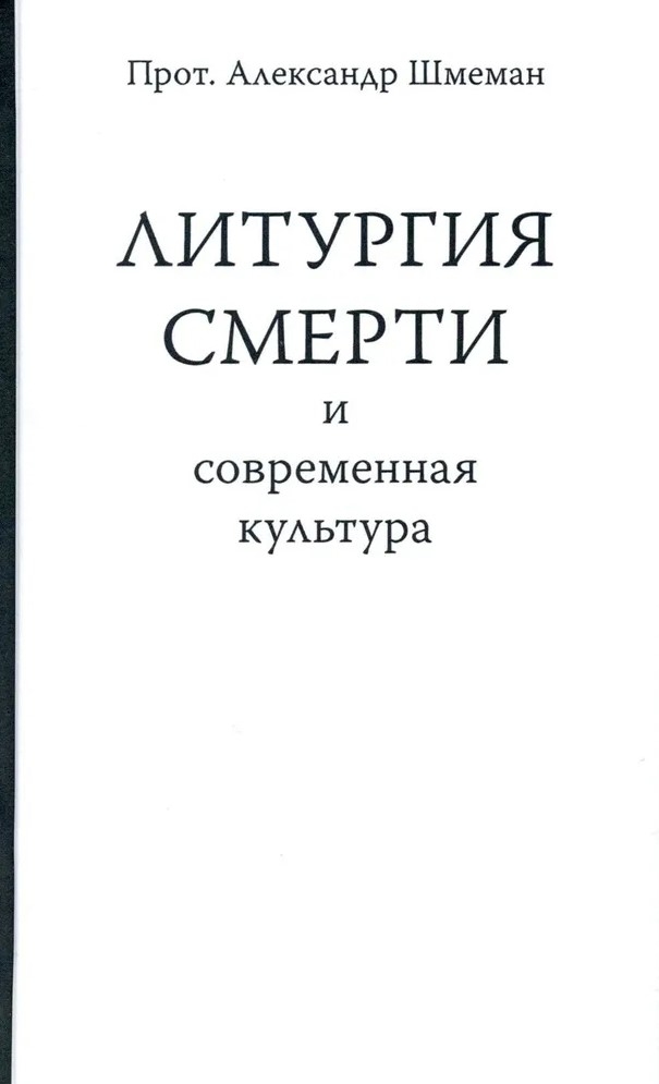 Viena no nozīmīgākajām 20. gadsimta Pareizticīgās baznīcas personībām, profesors un teologs arhibīskaps Aleksandrs Šmemans (1921–1983), vairāku grāmatu, slaveno "Dienasgrāmatu" un daudzu rakstu autors, daudzus gadus vadīja Svētā Vladimira semināru Ņujorkā, kur viņš nolasīja četras lekcijas par tēmu "Nāves liturģija un mūsdienu kultūra". Tāpat kā lielākā daļa tēva Aleksandra runu un publikāciju, arī šis nav tikai akadēmisks un teoloģisks pētījums. Autors ievieto nāves jautājumu plašā baznīcas kultūras un kristīgās pasaules uzskata, kā arī mūsdienu sabiedrības kontekstā, atklājot – spilgti un paradoksāli – nāves tēmu postkristietības kultūrā.