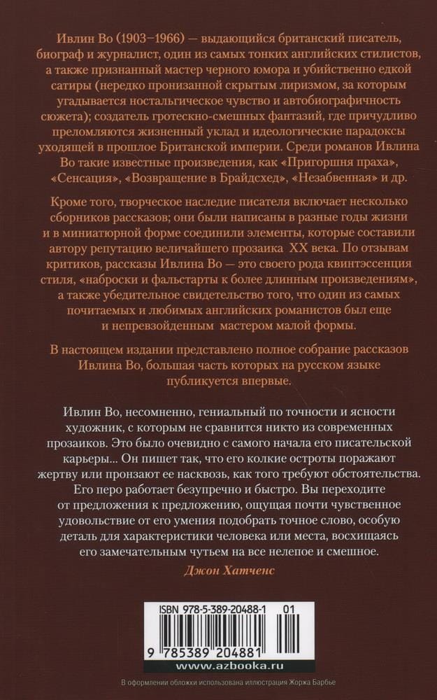 Evelīns Vovs (1903-1966) bija izcils britu rakstnieks, biogrāfs un žurnālists, viens no smalkākajiem angļu stilistiem, kā arī atzīts melnā humora un nāvējoši kodīgas satīras meistars (nereti caurvītas ar slēptu lirismu, aiz kura var nojaust nostalģisku izjūtu un sižeta autobiogrāfiskumu); groteski smieklīgu fantāzijas darbu autors, kuros savdabīgi lauzts aizejošās britu impērijas dzīvesveids un ideoloģiskie paradoksi. Evelaina Voga romānu vidū ir tādi slaveni darbi kā "Pelnu sauja", "Sensācija", "Atgriešanās uz Brideshead", "Neaizmirstamā" u. c. Turklāt rakstnieka radošajā mantojumā ir vairāki īso stāstu krājumi; tie tapuši dažādos dzīves gados un miniatūrā formā apvienojuši elementus, kas veidoja autora kā XX gadsimta izcilākā prozaiķa reputāciju. Pēc kritiķu domām, Evelaina Voga īsie stāsti ir sava veida stila kvintesence, "skices un viltus sākumi garākiem darbiem", kā arī pietiekams pierādījums tam, ka viens no visvairāk cienītajiem un iemīļotākajiem Anglijas prozaiķiem bija arī izcils īsās formas meistars. Šajā izdevumā apkopots pilns Evelina Voga īso stāstu krājums, no kuriem lielākā daļa krievu valodā publicēti pirmo reizi.