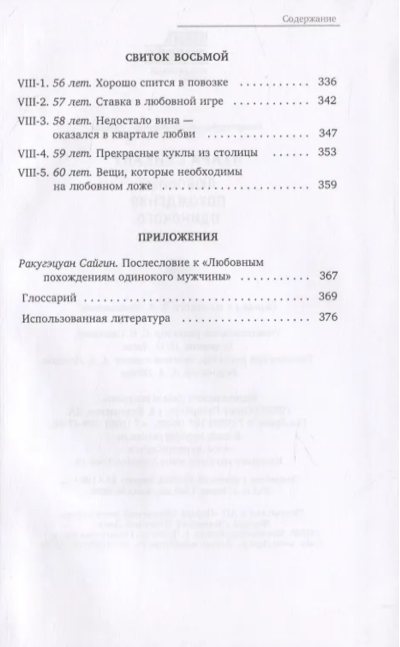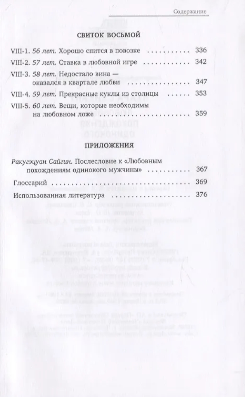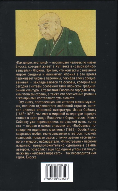 Saikaku grāmatas jau iepriekš ir tulkotas krievu valodā, bet ne šī — viņa pirmā un slavenākā grāmata "Vientuļa vīrieša mīlas vēsture" (1682). Unikālā mīlas mītņu pasaule, kas cieši saistīta ar teātri, dzeju un grafiku, šeit atklājas no asprātīga un gudra vērotāja skatupunkta. Pirmā izdevuma ilustrācijas, kuras, domājams, ir veidojis pats autors, piedāvā vēl vienu perspektīvu uz "šīs pasaules cilvēka" dzīvi — kā tiek tulkots varoņa vārds Jonosuke.