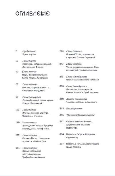 Krievijas vēsture bieži tiek attēlota vai nu kā iekarojumu un uzvaru virkne, vai arī kā nebeidzama vardarbības un apspiešanas hronika. Taču pastāv arī cita perspektīva. Šīs grāmatas varoņi ir svētie muļķi un svētie, svētceļnieki un ikonu gleznotāji, kā arī parastie cilvēki, kas, neskatoties uz nežēlību un vienaldzību, apliecināja brīvību un žēlsirdību. Katra nodaļa savieno likteni un pilsētu: metropolīts Filips strīdas ar caru, Fevronija pārspēj Muromas bojārus, Permas Stefans māca toleranci pret citiem, bet Simons Ušakovs meklē jaunu ikonogrāfijas valodu.