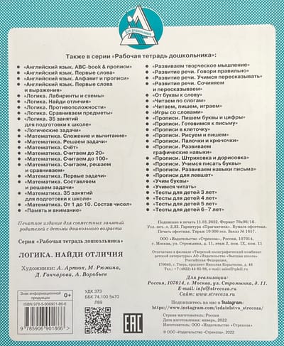 Darba burtnīca pirmsskolas vecuma bērnam "Loģika. Atrodi atšķirības". Paredzēta bērnu un vecāku kopīgām nodarbībām, gatavojoties skolai.