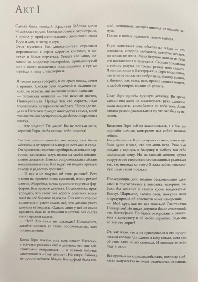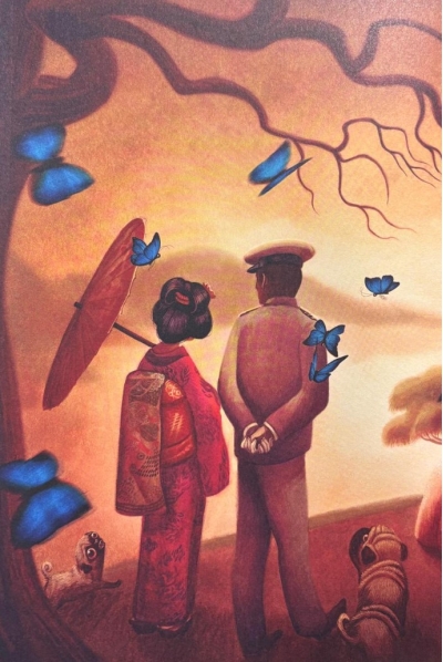 Šis stāsts par trauslas un maigas, tomēr stipras gribas jaunas japāņu meitenes traģisko likteni un viņas mīlestību pret nežēlīgu amerikāņu virsnieku kļuva par vienu no Džakomo Pučīni populārākajām operām un ir balstīts uz patiesiem notikumiem, kas risinājās 19. gadsimta beigās Japānā. Šī lieliskā mīlas drāma par patiesas mīlestības sadursmi ar šīs pasaules bezsirdību un meliem burtiski atdzīvojas no jauna šīs satriecošās dāvanu grāmatas lappusēs, ko ilustrējis pasaulslavenais mākslinieks Bendžamins Lakombs.
