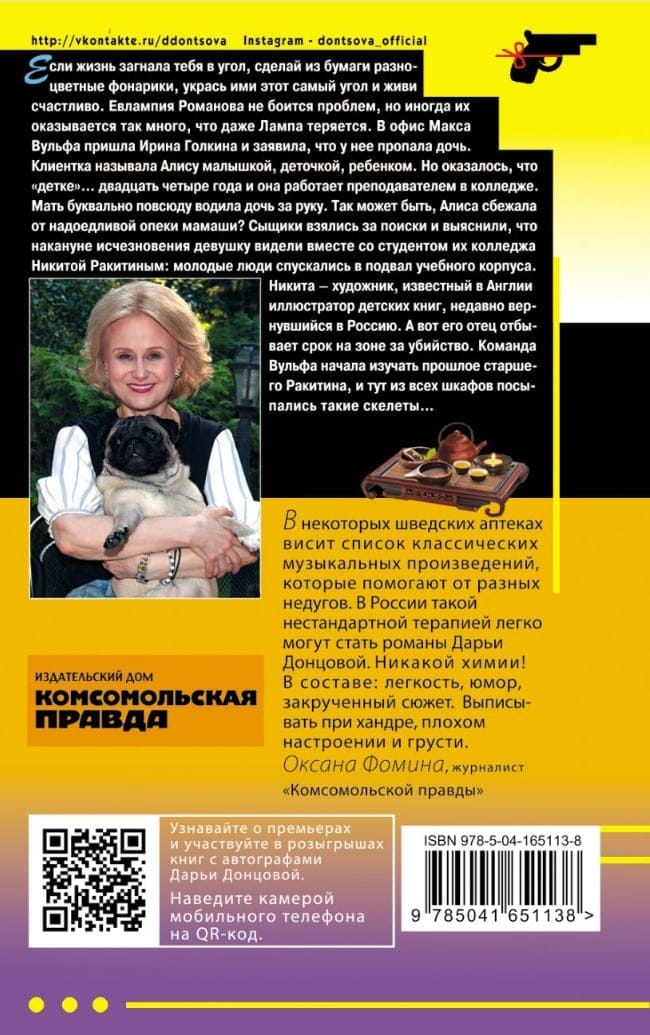 Ja dzīve tevi ir iedzinusi stūrī, pagatavo no papīra daudzkrāsainas laternas, izrotā ar tām šo stūri un dzīvo ilgi un laimīgi. Evlampija Romanova nebaidās no problēmām, bet dažkārt to ir tik daudz, ka pat Lampiņa pazūd. Irina Golkina ieradās Maksa Volfa birojā un apgalvoja, ka viņas meita ir pazudusi. Kliente sauca Alisi par bērnu, bērnu, bērnu. Taču izrādījās, ka "bērns"... divdesmit četrus gadus veca un viņa strādā par koledžas profesori. Māte savu meitu burtiski veda aiz rokas visur, kur vien viņa devās. Tātad, iespējams, Alise izbēga no kaitinošās mammas aizbildniecības? Detektīvi uzņēmās meklēšanu un noskaidroja, ka dienu pirms meitenes pazušanas tika redzēta kopā ar viņu koledžas studentu Ņikitu Rakitinu: jaunieši devās uz mācību ēkas pagrabu. Nikita ir mākslinieks, Anglijā labi pazīstams bērnu grāmatu ilustrators, kurš nesen atgriezies Krievijā. Savukārt viņa tēvs izcieš sodu zonā par slepkavību. Volfa komanda sāk pētīt vecākā Rakitina pagātni, un tad no visiem skapjiem izspraucas šādi skeleti....