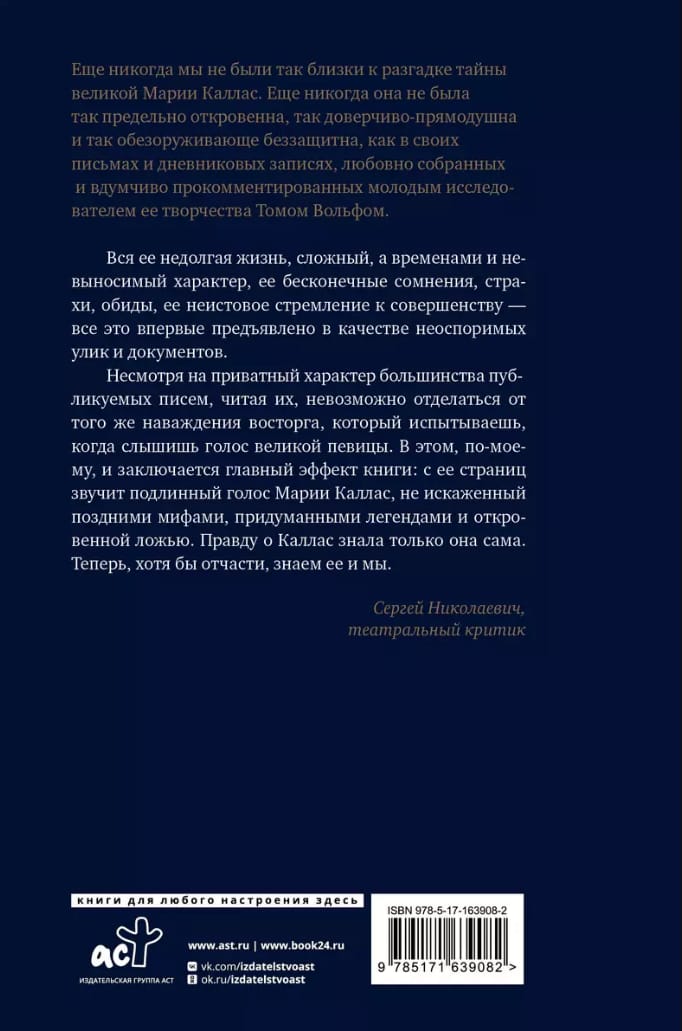 Pēc plaša rezonansi izraisījušas publikācijas Francijā Krievijā tiek izdota 20. gadsimta izcilākās operdziedātājas Marijas Kalasas (Maria Callas) memuāru grāmata. Grāmatā iekļauti dienasgrāmatas ieraksti, vēstules, kā arī retas fotogrāfijas. "Es uzrakstīju savus memuārus. Tie ir mūzikā, ko es izpildīju, - tā ir vienīgā valoda, kas man patiešām ir. Vienīgais veids, kā es varu runāt par savu mākslu un sevi. Un manos ierakstos, ciktāl tiem ir vērtība, ir saglabāts manas dzīves stāsts," raksta Marija Kalasa. Visi materiāli tiek publicēti pirmo reizi.