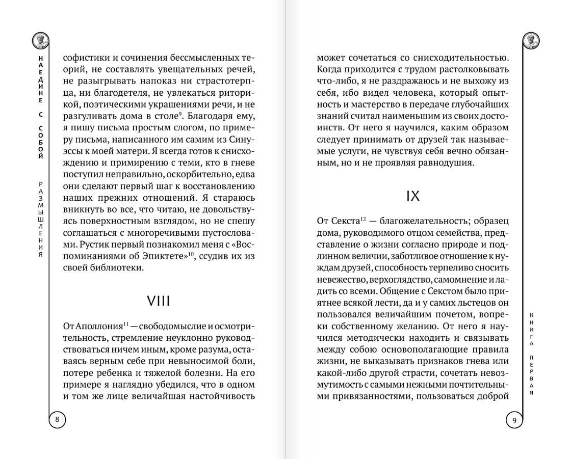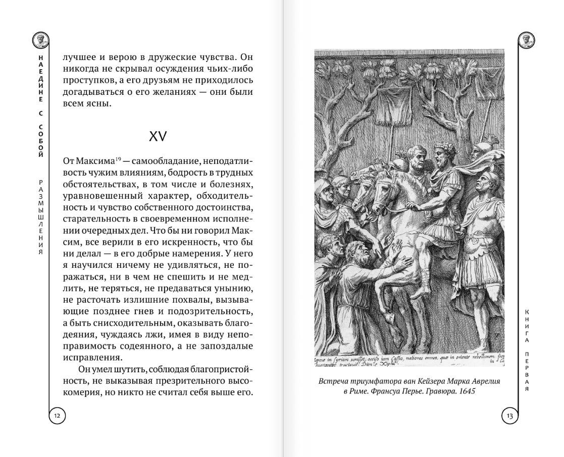 Marks Aurelijs Antonīns (121-180), Romas imperators, kura personiskie raksti kļuva par filozofisku atklāsmi viņa pēctečiem, kas viņu nodēvēja par "filozofu uz troņa", bija spiests savu dzīvi pavadīt militārajās kampaņās. Viņa "Meditācijas" ("Viens pats ar sevi") radās 2. gs. 70. gados mūsu ēras 70. gados karagājiena teltī. "Dzīves cīņas un klejojumi ir svešā zemē. Bet kas var vadīt ceļā? Nekas cits kā filozofija. Nāvei nav nekāda sakara ar mums, kad mēs eksistējam, tās nav; kad ir tā, mēs vairs nepastāvam." (Marks Aurelijs). Būdams vērīgs vērotājs, apveltīts ar retu intuīciju, Marks Aurelijs Antonīns sludināja pazemību un askēzi. Šajā ziņā viņa ētiskie uzskati, idejas par prātu un dvēseli bija tuvas Baznīcas skolotājiem un ietekmēja kristīgos domātājus no svētītā Hieronīma līdz Ļevam Tolstojam.