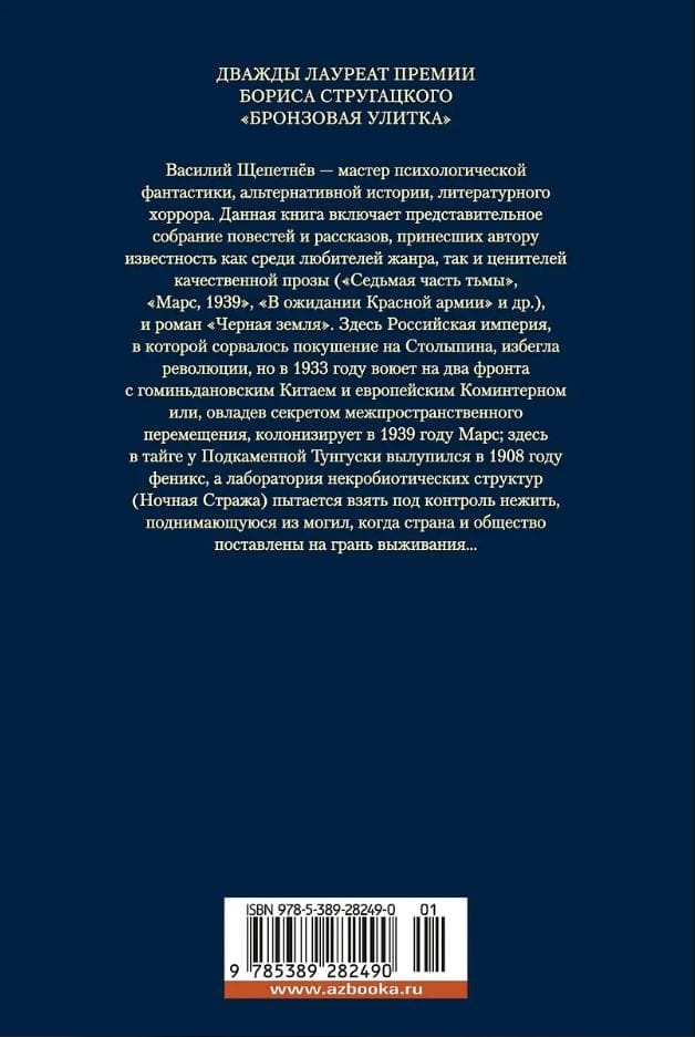 Vasilijs Ščepetņevs ir psiholoģiskās fantastikas, alternatīvās vēstures, literārās šausmu literatūras meistars un divkārtējs Borisa Strugacka Bronzas gliemeža balvas ieguvējs. Šajā grāmatā iekļauts reprezentatīvs stāstu un īso stāstu krājums, kas autoram atnesa slavu gan žanra cienītāju, gan kvalitatīvas prozas pazinēju vidū (Tumsas septītā daļa, Marss, 1939, Gaidot Sarkano armiju u.c.), un romāns Melnā zeme. Šeit Krievijas impērija, kurā neizdevās atentāts pret Stolipinu, izvairījās no revolūcijas, bet 1933. gadā cīnījās divās frontēs ar Gomintangu Ķīnu un Eiropas Kominternu jeb, apgūstot starpdimensionālās ceļošanas noslēpumu, 1939. gadā kolonizēja Marsu; šeit taigā pie Podkamennajas Tunguskas 1908. gadā izšķiļas fēnikss, un nekrobiotisko struktūru laboratorija (Nakts sardze) cenšas pārņemt kontroli pār nemirstīgajiem, kas ceļas no kapiem, kad valsts un sabiedrība tiek novesta uz izdzīvošanas robežas...