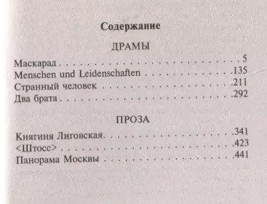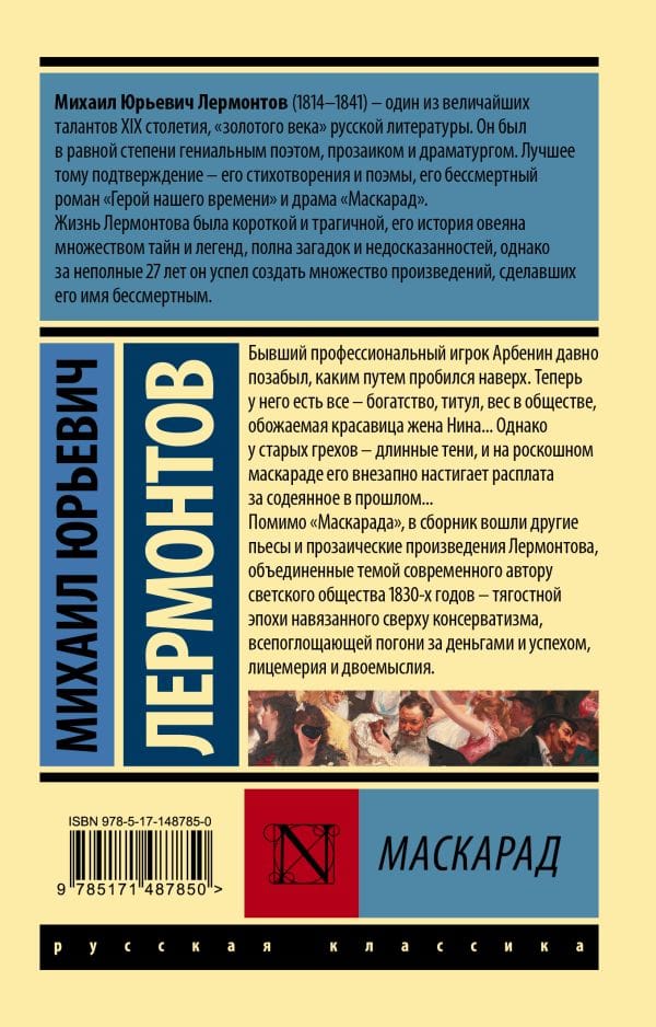 Arbenins, bijušais profesionāls spēlmanis, jau sen ir aizmirsis, kā viņš nokļuva virsotnē. Tagad viņam ir viss - bagātība, tituls, svars sabiedrībā, dievinātā, skaistā sieva Nina ... bet vecie grēki - garas ēnas, un greznā maskarādē viņu pēkšņi noķer, lai samaksātu par to, ko viņš ir darījis pagātnē ... Līdzās "Maskarādei" krājumā iekļautas arī citas Lermontova lugas un prozas darbi, kurus vieno tēma par autora laikmetīgo laicīgo sabiedrību 1830. gados - skarbo laikmetu, kurā valda no augšas uzspiests konservatīvisms, visatļautība pēc naudas un panākumiem, liekulība un divkosība.