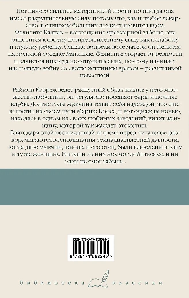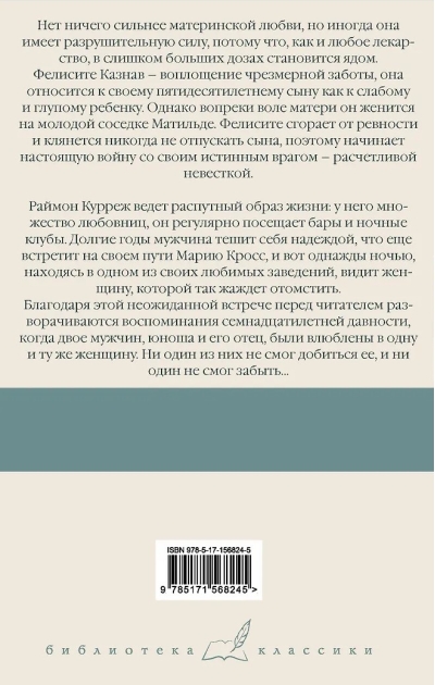 Reimonds Kurēžs dzīvo izlaidīgu dzīvi: viņam ir daudz mīļāko, un viņš regulāri apmeklē bārus un naktsklubus. Gadiem ilgi viņš lolo cerību, ka atkal satiks Mariju Krosu, un tad kādu nakti, atrodoties vienā no savām iecienītākajām iestādēm, viņš ierauga sievieti, kurai tik izmisīgi vēlas atriebties. Šī negaidītā tikšanās lasītāja acu priekšā atklāj atmiņas no pirms septiņpadsmit gadiem, kad divi vīrieši, jauns vīrietis un viņa tēvs, bija iemīlējušies vienā un tajā pašā sievietē. Neviens no viņiem nespēja viņu iekarot, nedz arī neviens nespēja viņu aizmirst...