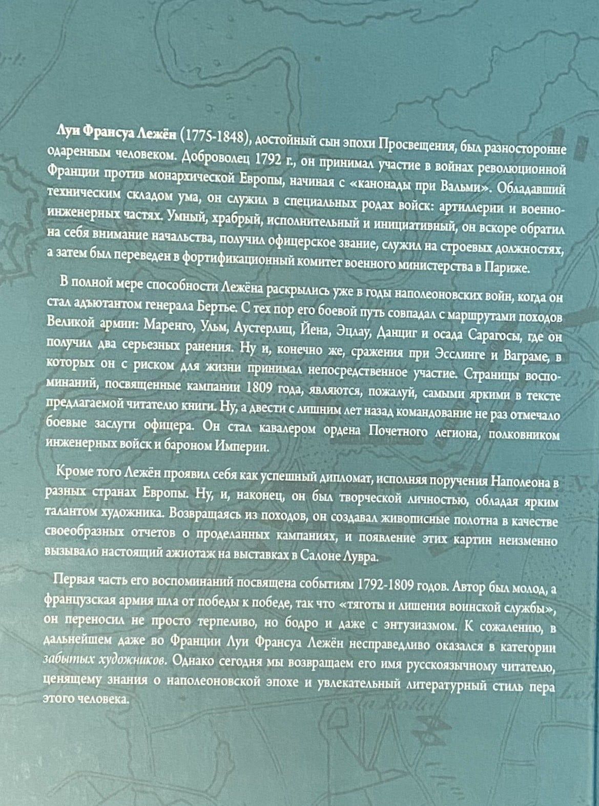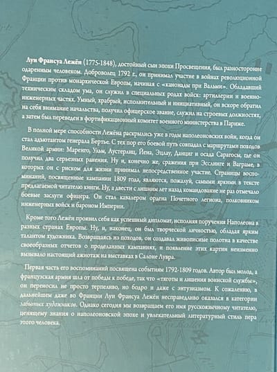 Viņa memuāru pirmā daļa ir veltīta 1792.–1809. gada notikumiem. Autors bija jauns, un Francijas armija soļoja no uzvaras uz uzvaru, tāpēc viņš "militārā dienesta grūtības un trūkumus" izturēja ne tikai pacietīgi, bet arī dzīvespriecīgi un pat entuziastiski. Diemžēl Luijs Fransuā Ležēns vēlāk netaisnīgi tika pazemināts uz aizmirsto mākslinieku kategoriju pat Francijā. Tomēr šodien mēs atjaunojam viņa vārdu krievvalodīgajiem lasītājiem.