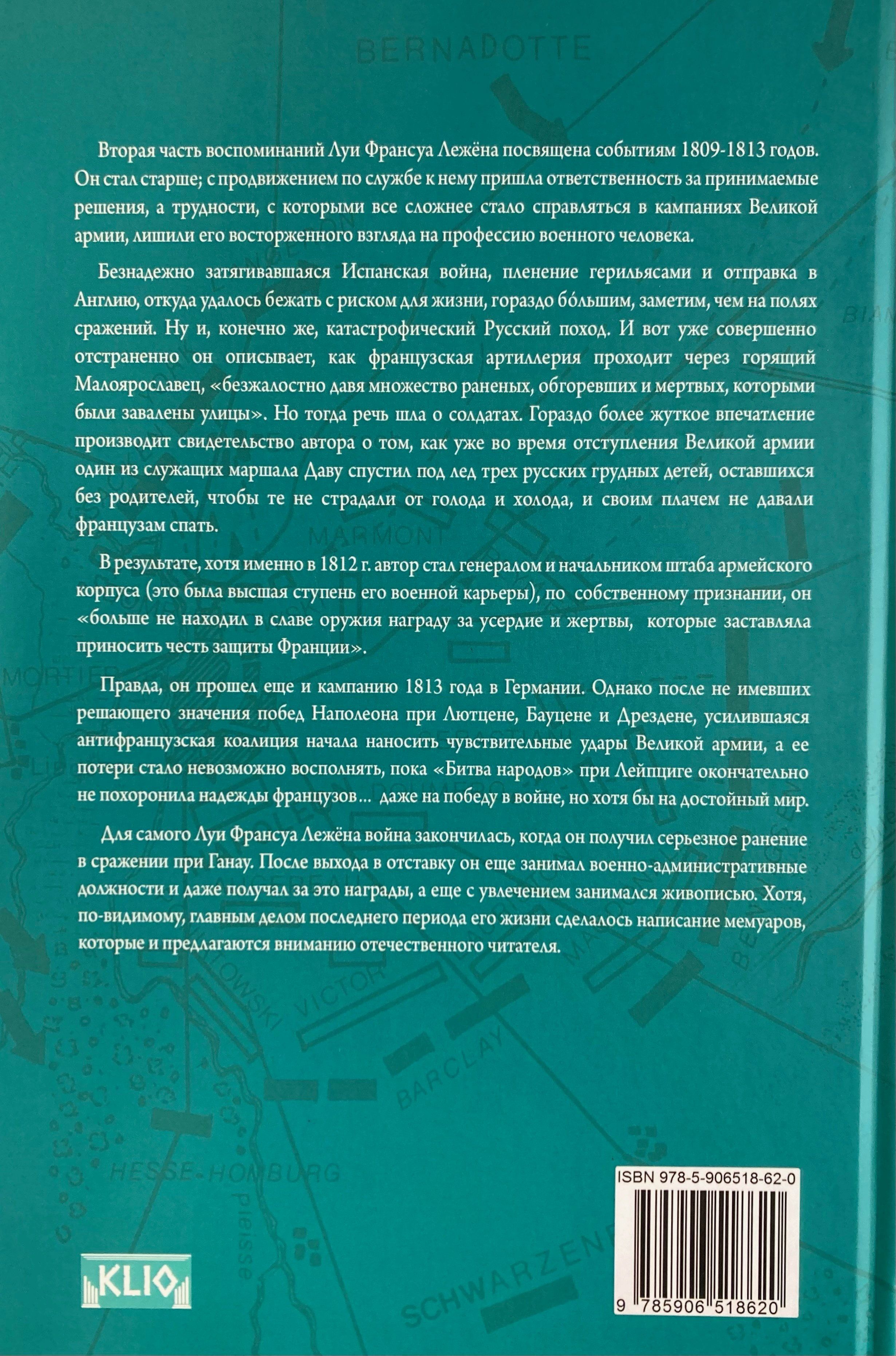 Luija Fransuā Ležēna memuāru otrā daļa ir veltīta 1809.–1813. gada notikumiem. Viņš bija kļuvis vecāks; līdz ar paaugstināšanu amatā nāca atbildība par lēmumiem, un arvien grūtākie Grande Armée kampaņu izaicinājumi atņēma viņam entuziastisko skatījumu uz militāro profesiju.