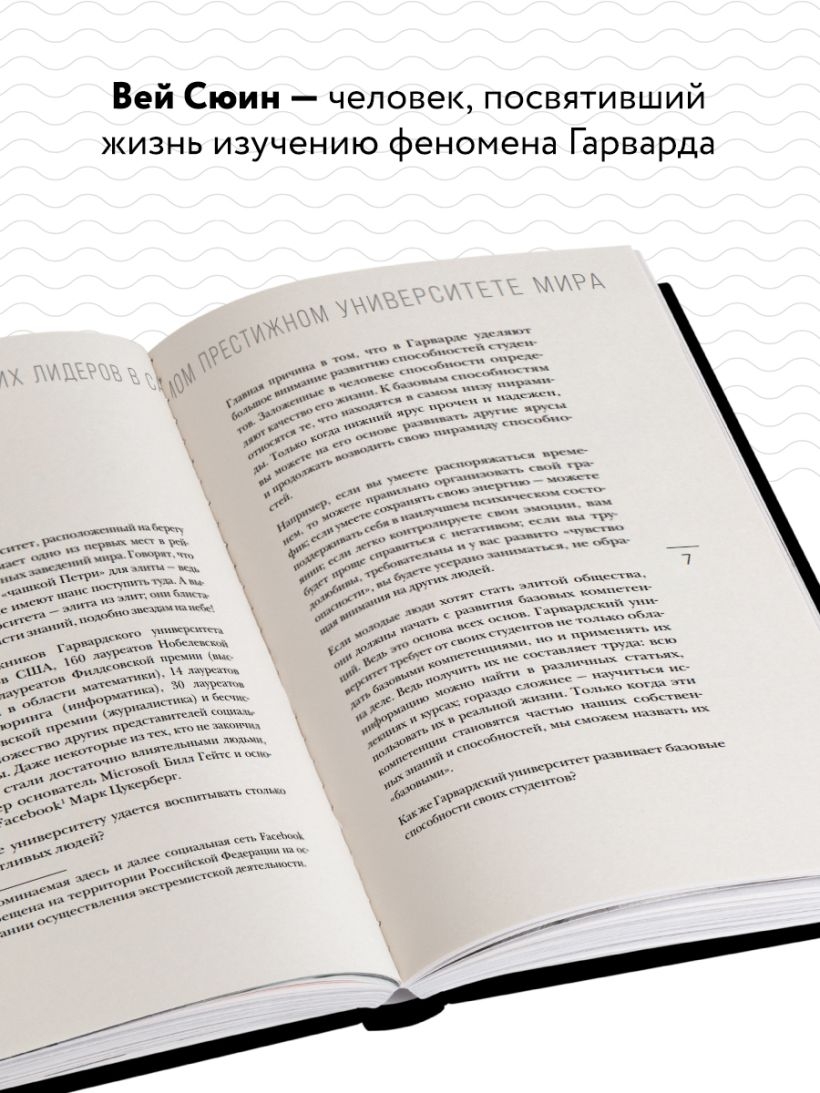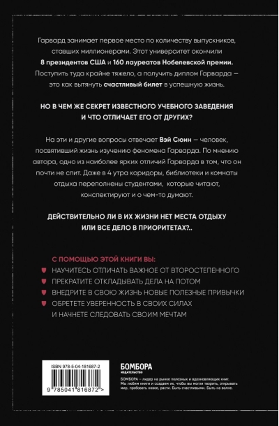 Vei Sjujins, cilvēks, kurš savu dzīvi ir veltījis Hārvarda fenomena izpētei, atbild uz šiem un citiem jautājumiem. Pēc autora domām, viena no Hārvarda pārsteidzošākajām iezīmēm ir tā, ka tā gandrīz neguļ. Pat pulksten 4 no rīta gaiteņi, bibliotēkas un atpūtas telpas ir pārpildītas ar studentiem, kas lasa, pieraksta un domā. Vai viņu dzīvē tiešām nav atpūtas, vai arī viss ir atkarīgs no prioritātēm?