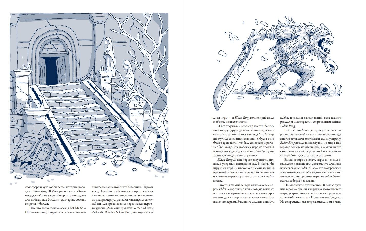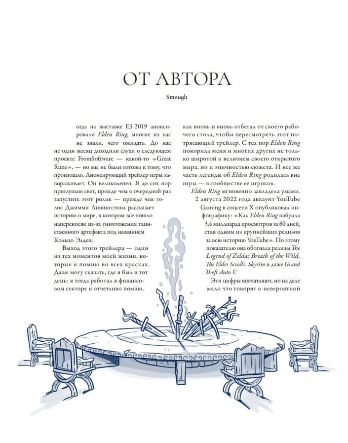 Džefs Truskots, pazīstams ar savu pseidonīmu SmoughTown, viens no spēles vadošajiem ekspertiem, ir sagatavojis detalizētu Elden Ring pasaules izpēti, tostarp "Erdtree ēnas" paplašinājumu. Džefa grāmata piedāvā izcilu skatījumu uz Starpzemi, rūpīgi izstrādājot katru tās vēstures elementu. Tas viss ir pasniegts unikālā un spilgtā manuskripta stilā.