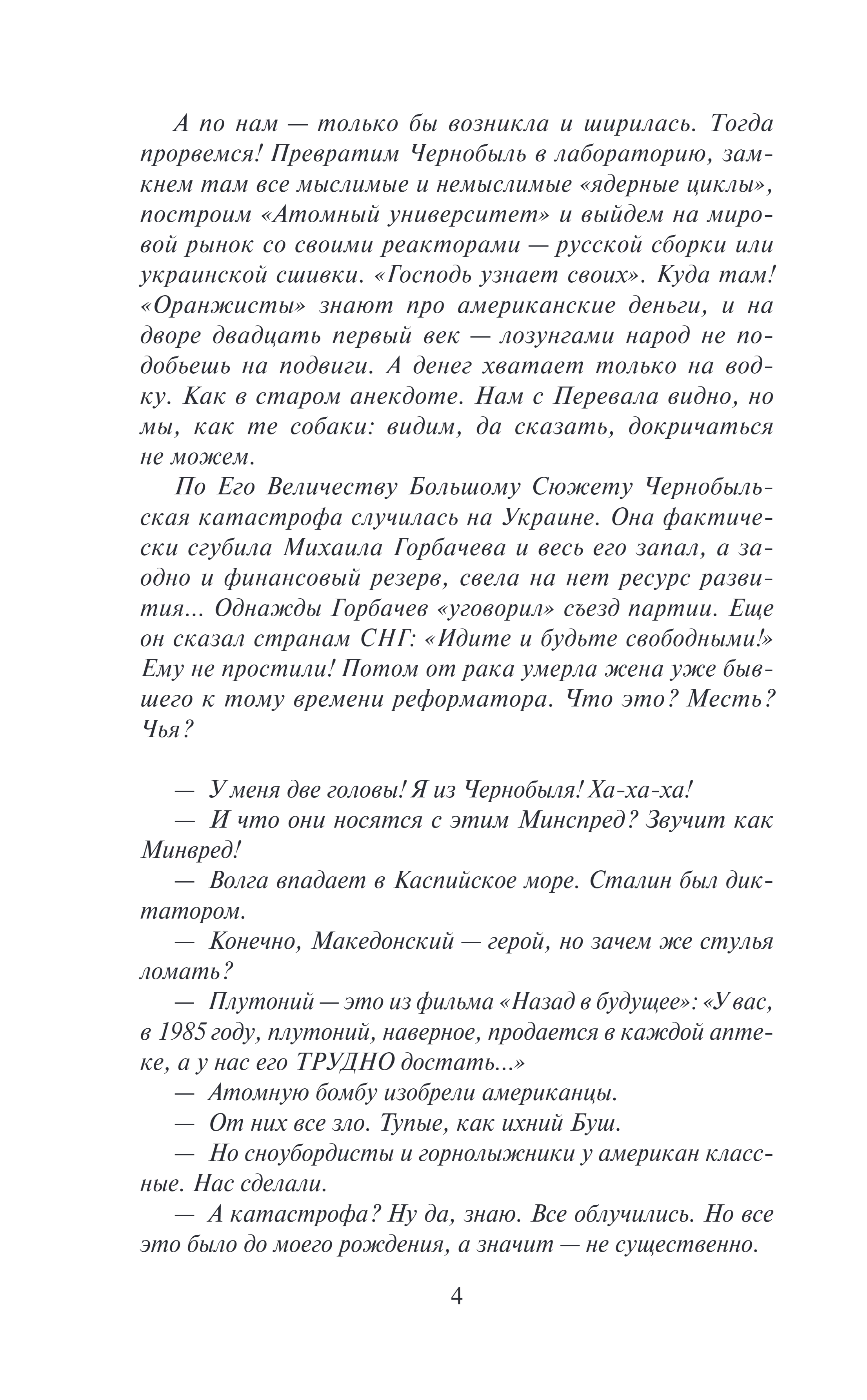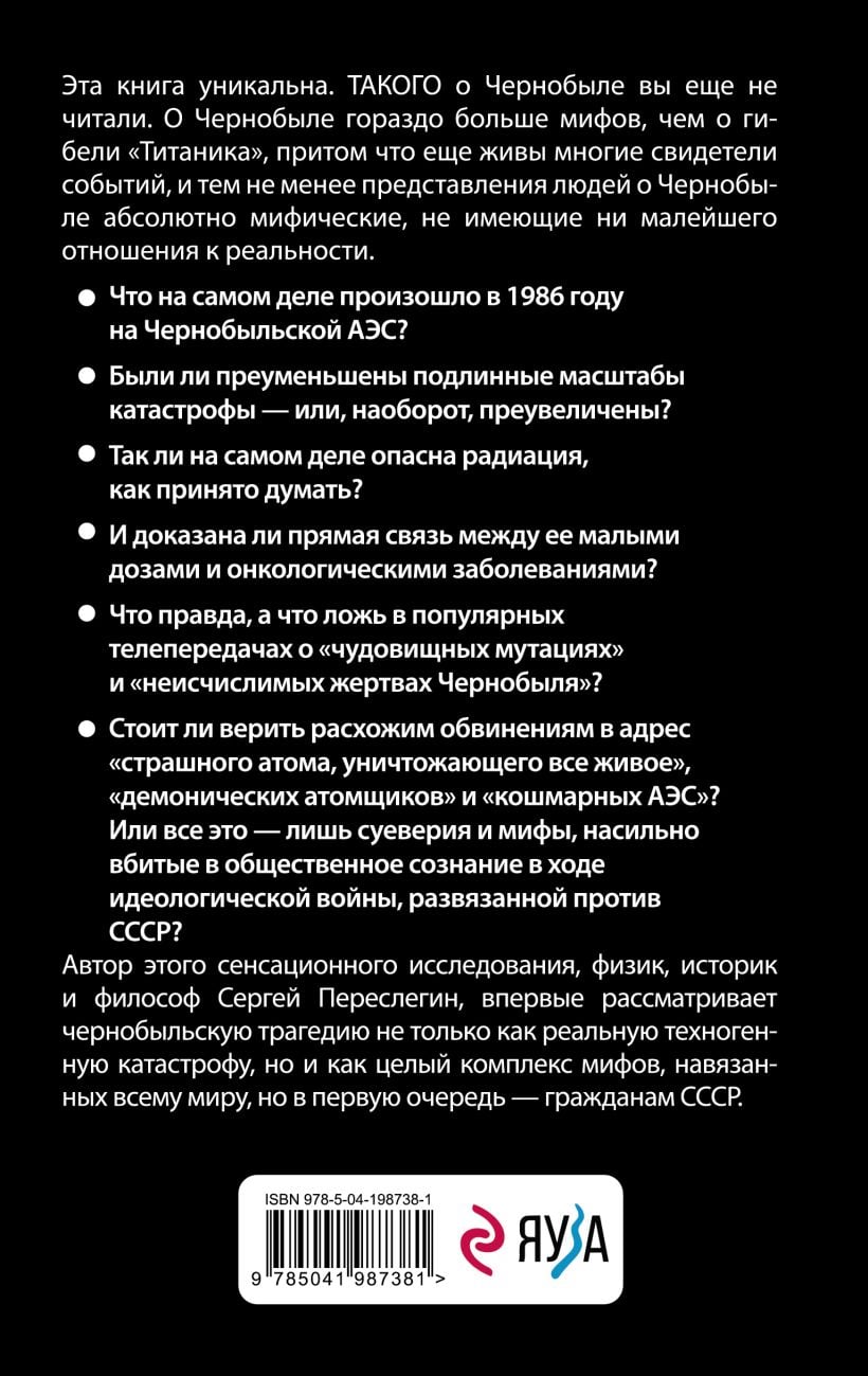 Kas īsti notika 1986. gadā Černobiļas atomelektrostacijā? Vai katastrofas patiesais mērogs bija pārspīlēts? Vai radiācija ir tik bīstama, kā jūs domājat? Un vai pastāv tieša saikne starp tā mazām devām un vēzi? Kas ir taisnība, un kādi ir meli populārajās TV programmās par “monstrozām mutācijām” un “neaprēķināmiem Černobiļas upuriem”? Vai ir vērts ticēt plaši izplatītajām apsūdzībām pret „briesmīgajiem atomiem, kas iznīcina visas dzīvās lietas”, „demoniskajiem kodolzinātniekiem” un „nakts atomelektrostacijām”? Vai arī šie māņticības un mīti, kas tika piespiesti sabiedrības apziņā ideoloģiskā kara laikā, karoja pret PSRS? Šī sensacionālā pētījuma autors fiziķis, vēsturnieks un filozofs Sergejs Pereslegins pirmo reizi Černobiļas traģēdiju uzskata ne tikai par īstu cilvēku radītu katastrofu, bet arī par visu mītu kompleksu, kas uzspiests visai pasaulei, bet galvenokārt PSRS pilsoņiem.