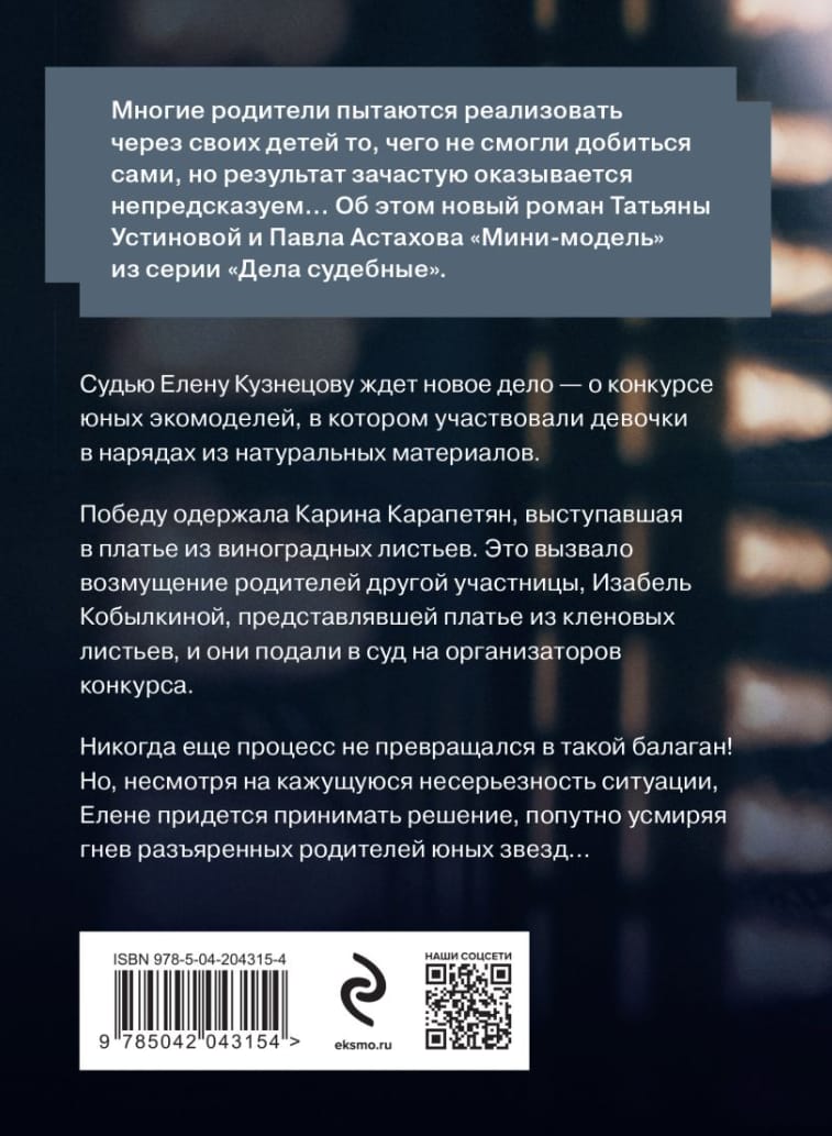 Pavla Astahova un Tatjanas Ustinovas asie romāni no autoru sērijas "Tiesu lietas" - tā vienmēr ir aizraujoša lasāmviela, kurā smeldzīga intriga savijas ar ikdienišķām situācijām, un stāstījums ir pilns kolorītu, neatkārtojamu personāžu. Zvaigžņu dueta raksturīgais humors brīnišķīgi mazina saspringto atmosfēru, padarot lasīšanu vieglu un interesantu. Kā ierasts, sižeta centrā ir kāda skaļa lieta, kuru izskata stingrā un nevainojamā tiesnese Jeļena Kuzņecova.