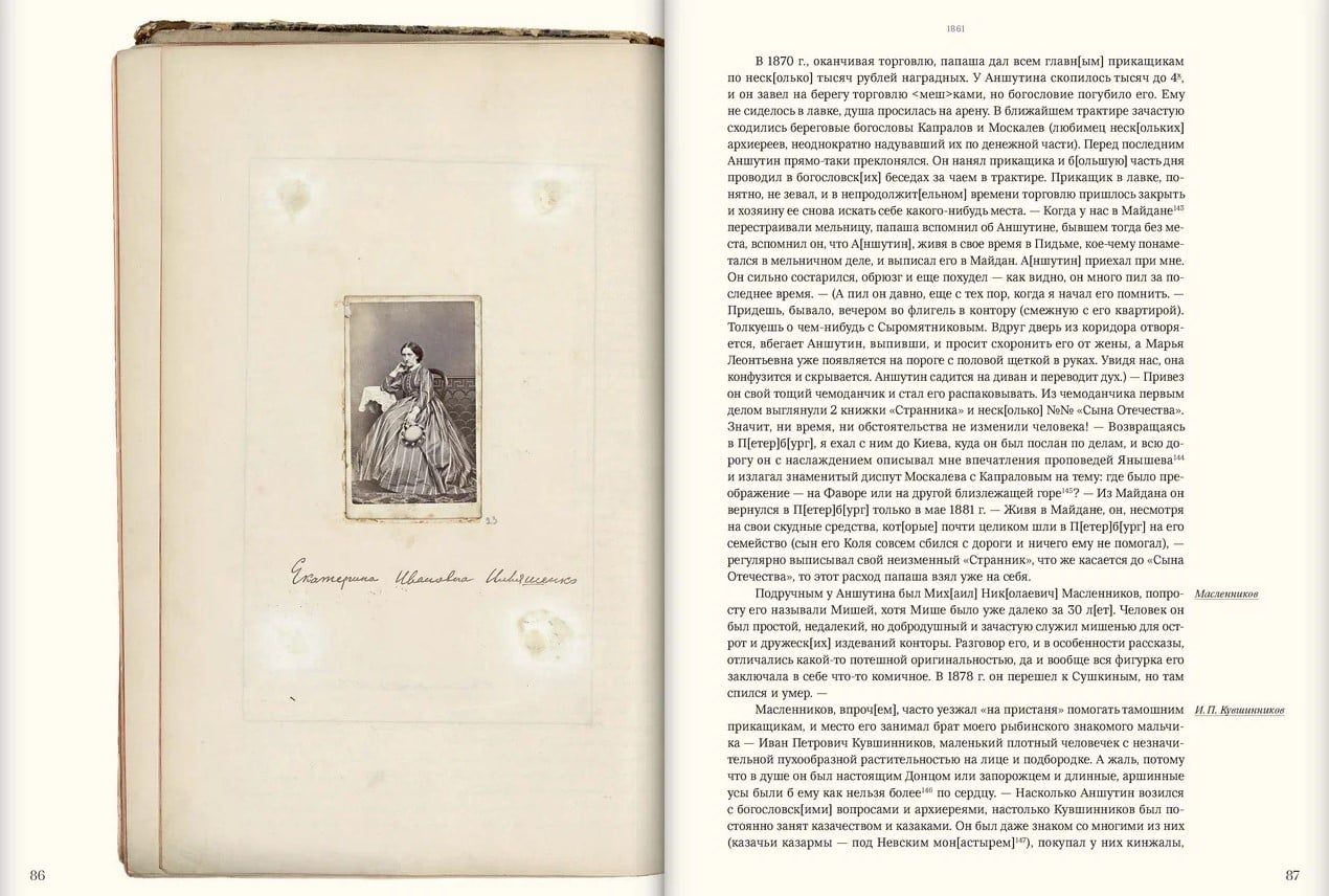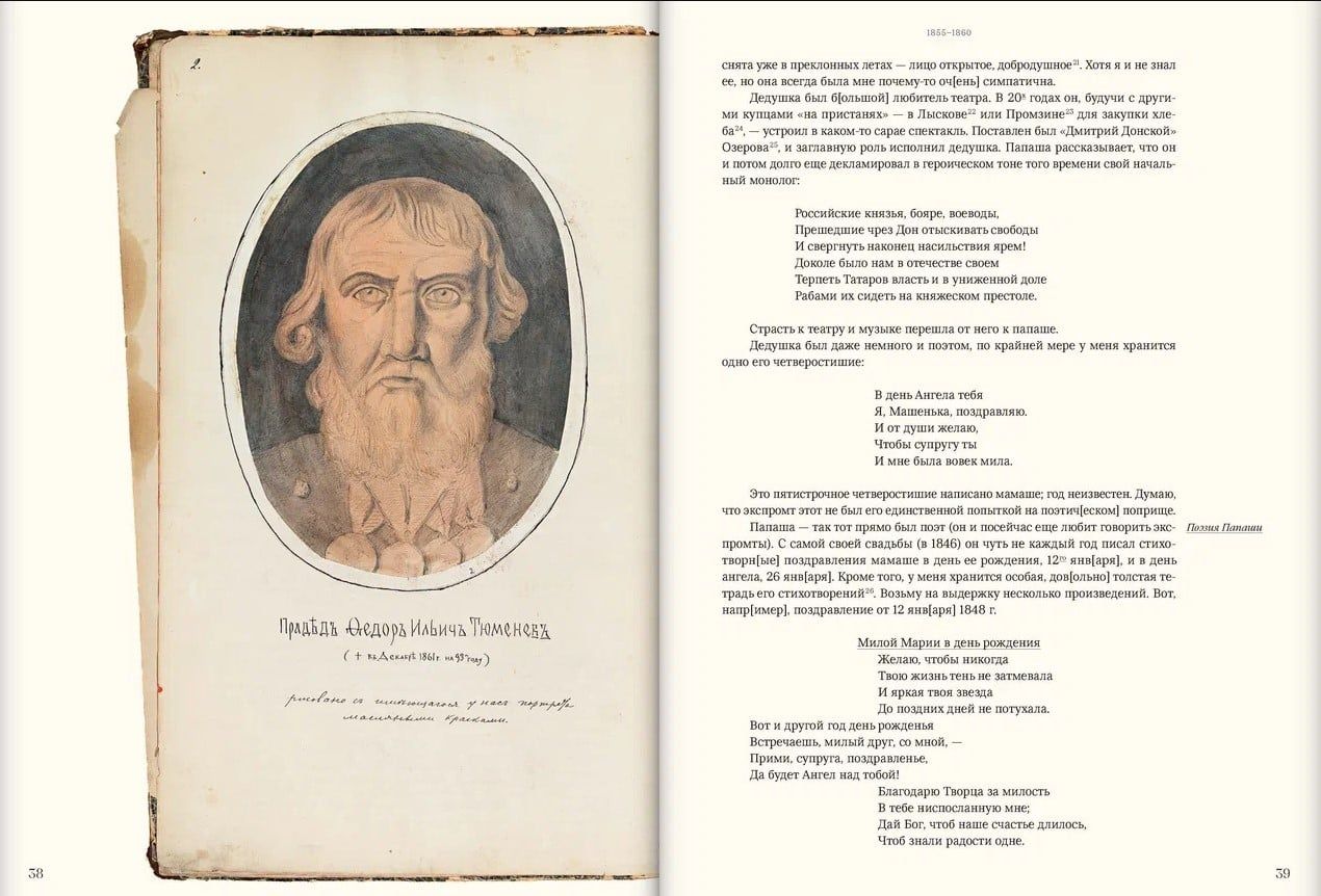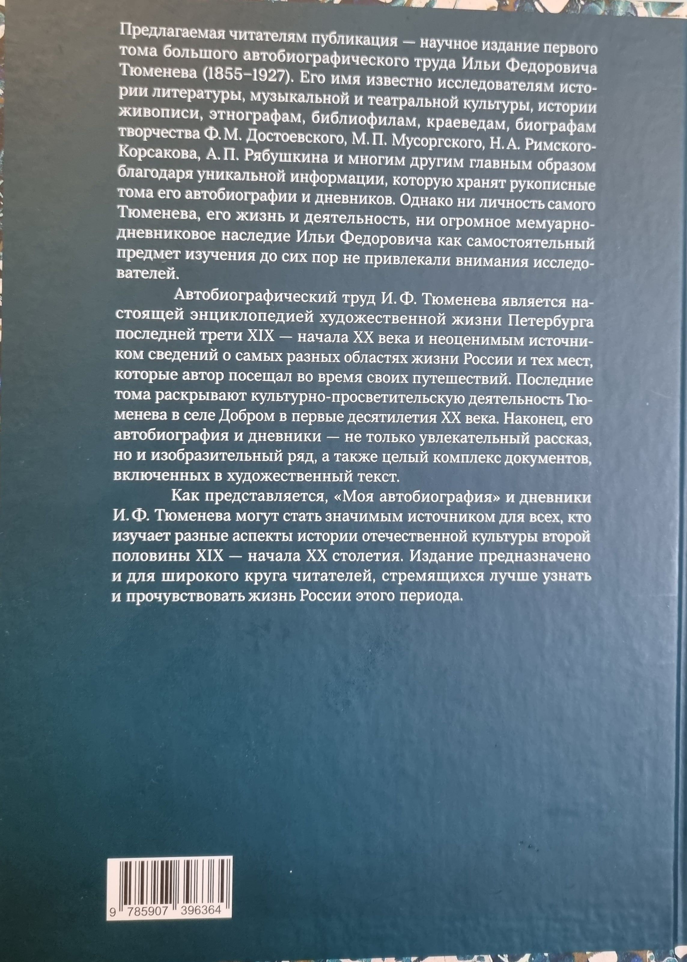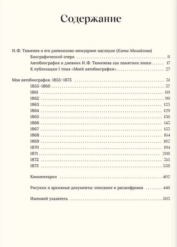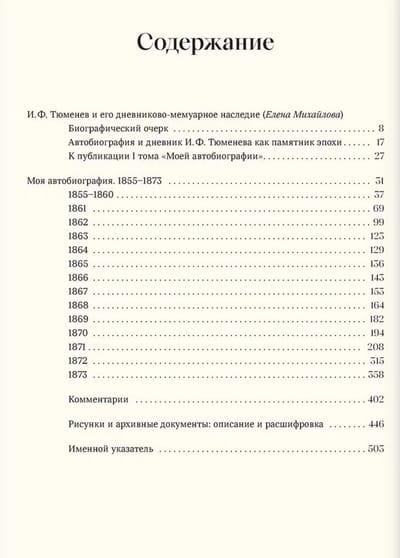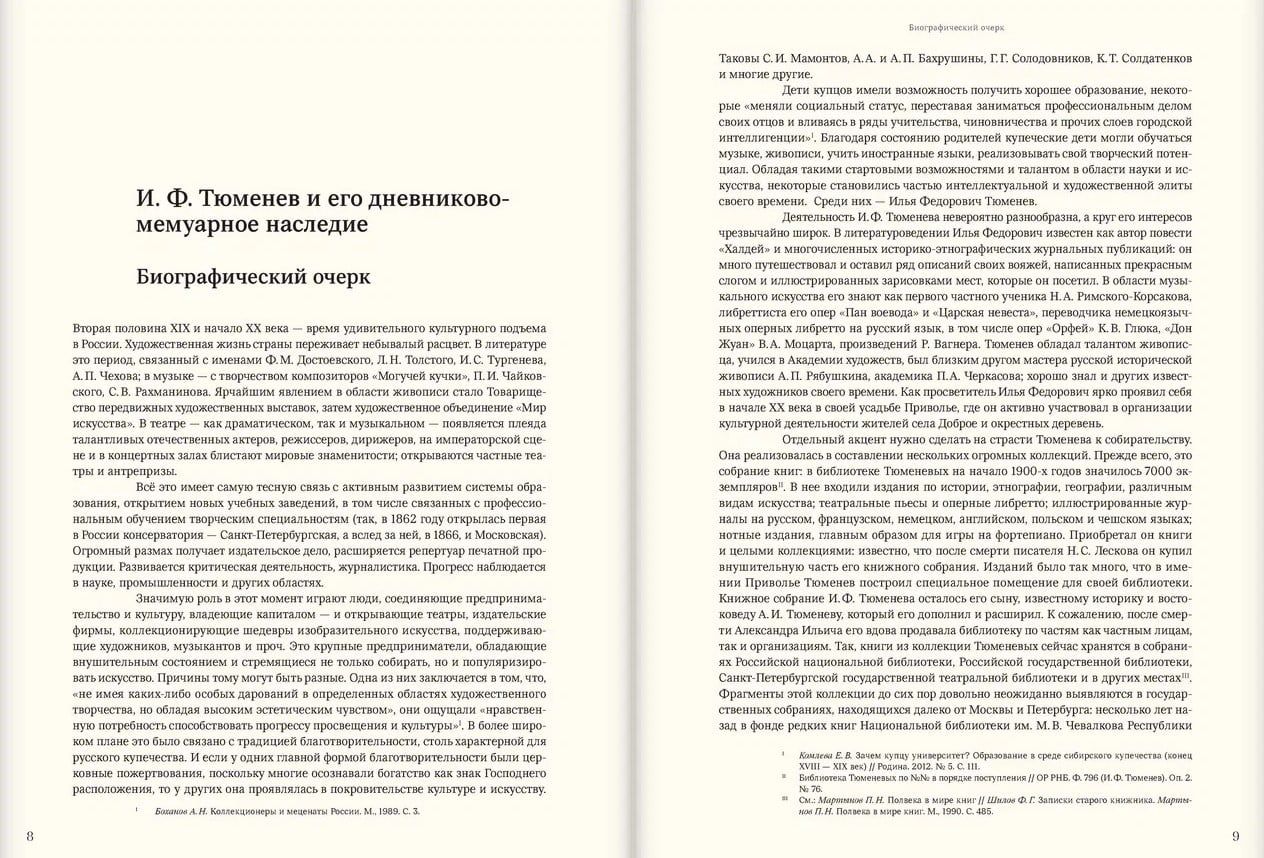 Šis izdevums ievada rakstnieka, publicista, mūziķa, mākslinieka, tulkotāja un kolekcionāra I. F. Tjumeņeva (1855–1927) apjomīga autobiogrāfiska darba publikāciju. Pirmajā “Manas autobiogrāfijas” sējumā ir informācija par Tjumeņevu ģimeni, Ribinskas tirgotājiem; par autora bērnību un jaunību, cilvēkiem, kas viņu ieskauj; par mācībām G. Vīdemana ģimnāzijā; teātra iespaidi un aizraušanās ar Mariinska teātra balerīnu; par ceļojumiem uz Valaamu un saviem pirmajiem ārzemju ceļojumiem, kuru laikā viņš apmeklēja Itāliju, Vāciju, Šveici, Holandi, Angliju un Franciju. I. F. Tjumeņevs stāstījumu ved uz 1873. gada beigām. Pieminekļa īpaša iezīme ir ievērojama skaita zīmējumu un dokumentu, kas pielīmēti pie loksnēm, autobiogrāfijas iekļaušana mākslinieciskajā laukā. Visas šīs lapas publikācijā ir pieejamas kā digitālas kopijas. Īpašā sadaļā ir zīmējumu apraksti, kā arī vēstuļu un ar roku rakstītu teksta dokumentu daļu transkripts.