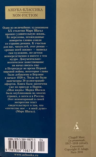 "Mana dzīve" ir autobiogrāfisks romāns, dokumentāli-poētisks stāstījums, ko sarakstījis Marks Šagāls, izcils mākslinieks, kura dzīve vēsturisku pārmaiņu dēļ sadalījās starp Vitebsku un Parīzi, starp Krieviju un Franciju. Tulkojums krievu valodā (labots šim izdevumam) pieder Natālijai Mavļevičai, Meistara balvas ieguvējai.