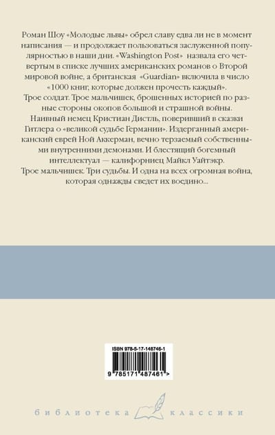 Šova "Jaunie lauvas" ieguva slavu gandrīz uzreiz pēc sarakstīšanas un pelnītu popularitāti turpina baudīt arī šodien. "Washington Post" to ierindoja ceturtajā vietā labāko amerikāņu romānu sarakstā par Otro pasaules karu, bet britu "Guardian" iekļāva to starp "1000 grāmatām, kuras vajadzētu izlasīt ikvienam". Trīs karavīri. Trīs zēni, kurus vēsture iemeta dažādās lielā un briesmīgā kara tranšeju pusēs. Naivais vācietis Kristians Distls, kurš ticēja Hitlera pasakām par "Vācijas lielo likteni". Mocītais amerikāņu ebrejs Noa Akermans, kuru mūžīgi mocīja viņa paša iekšējie dēmoni. Un izcils bohēmas intelektuālis kalifornietis Maikls Vitakrs. Trīs zēni. Trīs likteņi. Un viens uz visiem milzīgs karš, kas kādu dienu viņus savedīs kopā...