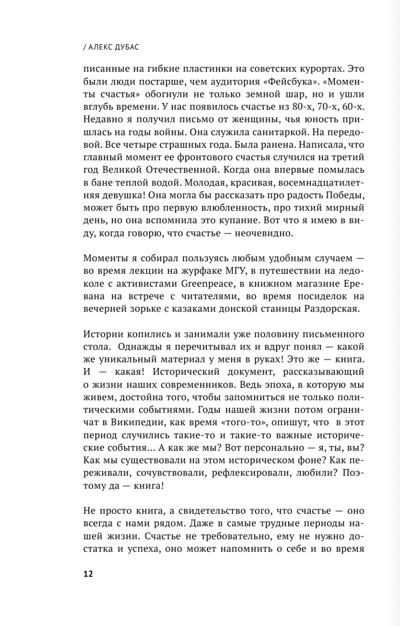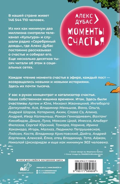 Mūsu valstī dzīvo 146 544 710 cilvēki. No tiem vismaz divi miljoni skatījās televīzijas kanālu "Kultūra" un klausījās radio "Sudraba lietus", kur Alekss Dubass nepārtraukti runāja par laimi un tās vākšanu. Vēl daži desmiti tūkstoši par to lasīja sociālajā tīklā Facebook. Katrs izlasītais laimes mirklis ēterā, katrs ieraksts atgriezās ar aizvien jauniem stāstiem. To šeit ir gandrīz tūkstotis. Jūsu rokās ir laimes koncentrāts un katalizators. Jūsu pašu laika mašīna. Tātad. Artjoms un Jūlija, Mihails Žvaneckis, Ingeborga Dapkunaite, Asja, Vladimirs Menšovs, Vano, Olga, Andrejs Šarovs, Katerina, Akims, Slava Se, Alina, Andrejs, Ivars Kalniņš, Romāns Gennadjevičs, Vahtangs Kikabidze, Daša, Luka, Maksims Chaja, Inesa, Alberts Filozovs, Sergejs Jurskis, Tamāra, Narine, Irina Hakamada, Igors, Malhazs, Ludmila Petruševskaja, Lajsans, Kostja, Vladimirs Kristovskis, Daiga, Andrejs Bartenēvs, Aleksejs, Jolka, tēvs Vladimirs, Tata, Aizans, Nikolajs Ciskaridze un vismaz 903 citi.