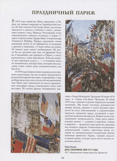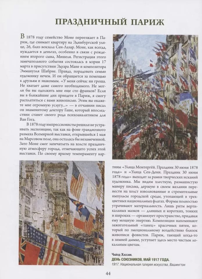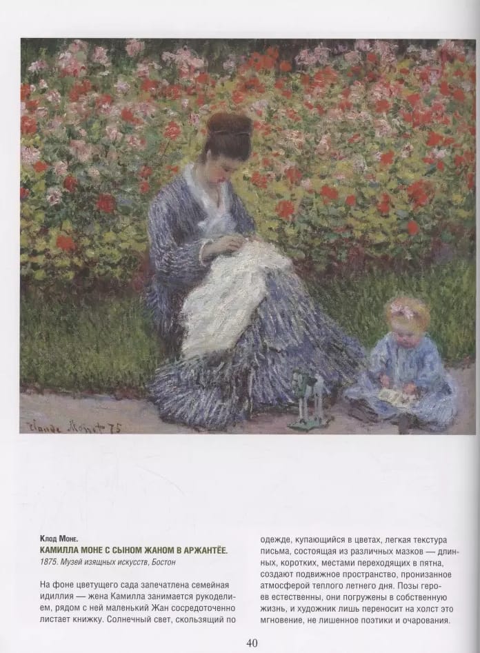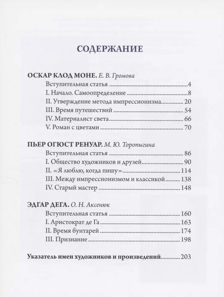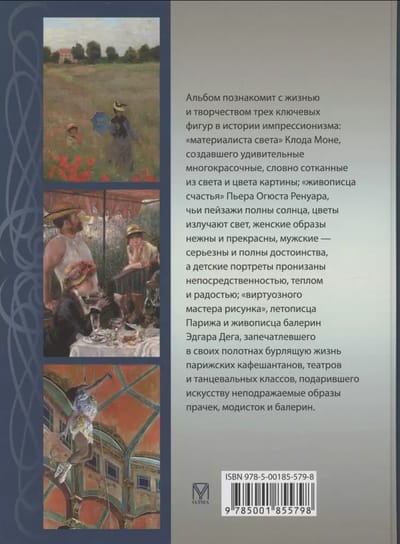 Albums iepazīstina ar trīs impresionisma vēsturē nozīmīgu personību dzīvi un daiļradi: "Pjērs Ogausts Renuārs (Pierre Auguste Renoir), kura ainavas ir pilnas saules gaismas, ziedi izstaro gaismu, sieviešu tēli ir maigi un skaisti, vīriešu tēli - nopietni un cieņas pilni, bet bērnu portreti ir pārņemti ar spontanitāti, siltumu un prieku, un viņa gleznas "gaismas materiālists" Klods Monē (Claude Monet) radīja pārsteidzošas daudzkrāsainas gleznas, kas bija it kā austas no gaismas un krāsas; "virtuozais zīmēšanas meistars", Parīzes hronists un balerīnu gleznotājs Edgars Degā, kurš savās gleznās attēlojis Parīzes kafejnīcu, teātru un deju klašu rosīgo dzīvi, devis mākslai neatkārtojamus veļas mazgātāju, modistu un balerīnu tēlus.