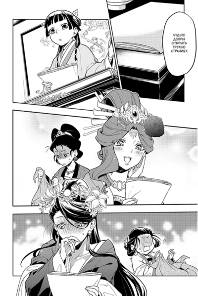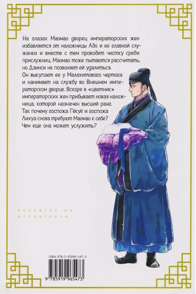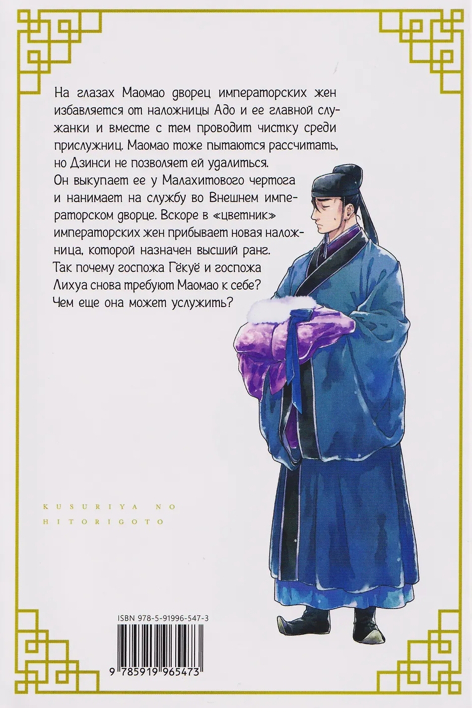 Maomao acu priekšā Imperatora sievu pils atbrīvojas no konkubīnes Ado un viņas galvenās kalpones, vienlaikus attīrot savus kalpus. Viņi mēģina atlaist arī Maomao, bet Džinši neļauj viņai aiziet. Viņš nopērk viņu no Malahītu pils un nolīgst kalpošanai Ārējā Imperatora pilī. Drīz imperatora sievu "ziedu dārzā" ierodas jauna konkubīne, paaugstināta augstākajā pakāpē. Tad kāpēc lēdija Gjokujo un lēdija Lihua atkal pieprasa Maomao klātbūtni? Ko gan citu viņa var darīt viņu labā?