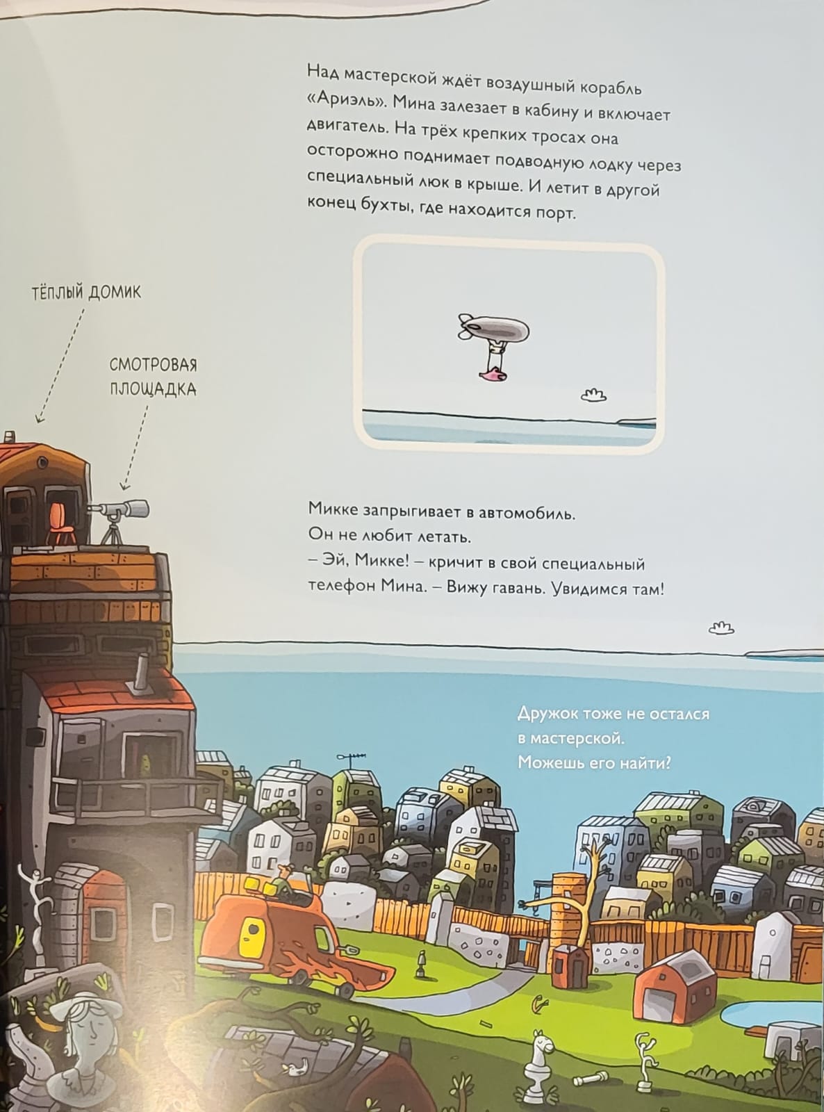 Zviedru rakstnieks un mākslinieks Čels Tursons daudzējādā ziņā turpina pasaulslavenā Svena Nordkvista tradīcijas: viņš izdomājis aizraujošus stāstus par mazo piedzīvojumu meklētāju Minu un viņas gudro, bet piesardzīgo draugu Mikki un pats tos realizējis detalizētās un asprātīgās ilustrācijās. Šīs grāmatas attēli ne tikai pavada stāstu, bet arī rada savu īpašu pasaku telpu. Jebkuram bērnam patiks tās pētīt. Zivju ordas, jūras labirinti un visbeidzot atkritumu kalns! Un Mikes darbnīcā ir daudz ko atklāt!
