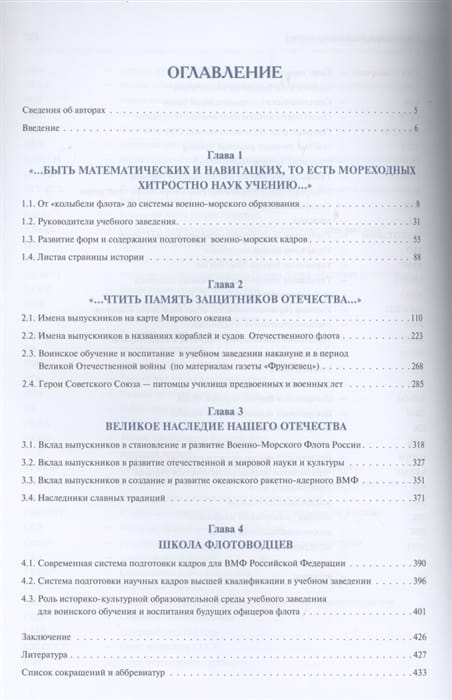 Monogrāfija iepazīstina ar Krievijas pirmās laicīgās augstākās jūras izglītības iestādes veidošanās un attīstības galvenajiem pagrieziena punktiem kā nepārtrauktu virkni spilgtu sasniegumu un sasniegumu tās sienās un jūrā, zinātnes, izglītības, kultūras jomā. Īpaša uzmanība pievērsta izglītības iestādes darbības vēsturiskajai nozīmei caur galveno kvalitatīvo rādītāju - audzēkņiem un absolventiem, kuri guvuši izcilus panākumus, atstājuši nozīmīgu nospiedumu Krievijas vēsturē, kļuvuši par mūsu Tēvzemes varoņiem un uz visiem laikiem ierakstījuši savus vārdus ģeogrāfiskajos nosaukumos Pasaules okeāna kartē, flotes kuģu un kuģu nosaukumos. Pētījumā tika izmantots plašs materiālu kopums, kas ļāva sniegt objektīvu izglītības iestādes novērtējumu, neizlaižot no redzesloka tās vadītāju, skolotāju un audzēkņu nopelnus un slavu. Ierosināti izglītības iestādes turpmākās attīstības ceļi, balstoties uz tās vēsturisko un kultūrvides izglītības vidi flotes topošo virsnieku militārajai apmācībai un izglītošanai. Plašam lasītāju lokam, kas nodarbojas ar pētniecību jūrniecības mantojuma, jūrniecības izglītības, militārās apmācības un audzināšanas, militāri patriotiskā darba ar jaunatni jomā.