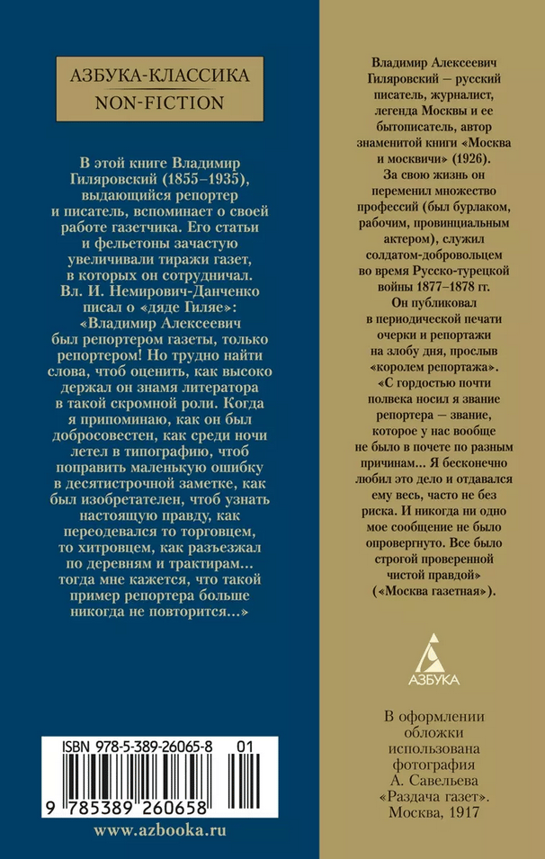 Vladimirs Alekseevičs Džiljarovskis (1855—1935) bija krievu rakstnieks, žurnālists, Maskavas leģenda un viņas ikdienas rakstniece, slavenās grāmatas Maskava un maskavieši (1926) autore. Grāmatā „Maskavas avīze" (publicēts 1960) viņš atceras savu darbu periodiskajā presē, kur publicēja esejas un referātus par dienas tēmu. Giļarovskis bija pazīstams kā „ziņošanas ķēniņs", kļūstot par vienu no sava laika labākajiem hroniķiem. Viņa raksti un fuilletoni bieži palielināja to laikrakstu apriti, kuros viņš sadarbojās, no kuriem mēs šodien uzzinām par pirmsrevolucionārās Krievijas dzīvi. Jau gandrīz pusgadsimtu es ar lepnumu esmu ieguvis reportiera titulu, kuru dažādu iemeslu dēļ mēs necienījām augstu. Es to nebeidzami mīlēju un visu tai iedevu, bieži ne bez riska. Neviens no maniem vēstījumiem nekad nav ticis noliegts. Viss bija stingrs, pārbaudīts, tīra patiesība (V. A. Giļarovskis).