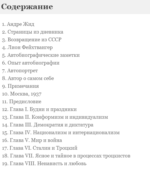 Izdevumā iekļautas divas savā laikā bēdīgi slavenas Rietumu rakstnieku grāmatas: A. Žīda "Atgriešanās PSRS", kas izdota 1936. gadā un tulkota tikai 1989. gadā, un slavenā L. Feihtvangera grāmata "Maskava 1937". Šo polemisko darbu salīdzinājums ir īpaši interesants: tās ir autoritatīvu un talantīgu cilvēku liecības, viņu iespaidi par notikumiem sarežģītā un pretrunīgā mūsu valsts dzīves periodā.