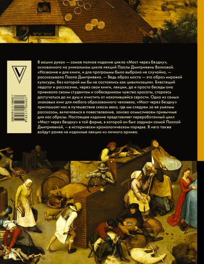 Jūsu rokās ir cikla "Tilts pār bezdibeni" vispilnīgākais izdevums, kura pamatā ir unikālais Paolas Volkovas lekciju cikls. Gan grāmatas, gan programmas nosaukums nav izvēlēts nejauši," teica Paola Dmitrijevna. - Galu galā tilta tēls ir pasaules kultūras tēls, bez kura mēs nebūtu civilizācija". Brīnišķīga skolotāja un stāstniece, viņa savās grāmatās, lekcijās un vienkārši sarunās iedvesa savos studentos un sarunu biedros skaistuma izjūtu, cenšoties sasniegt viņu dvēseles un attīrīt tās no uzkrātās pelēcības. Viena no ikoniskākajām grāmatām ikvienam izglītotam cilvēkam, "Tilts pāri bezdibenim" aicina mūs ceļojumā cauri gadsimtiem, kurā mēs sekojam viņas prasmīgajam stāstījumam, iesaistāmies stāstījumā un pārdomājam pazīstamus tēlus. Šajā izdevumā pārstrādātais cikls "Tilts pār bezdibeni" tiek piedāvāts tādā formā, kādā to bija iecerējusi pati Paola Dmitrijevna - vēsturiski hronoloģiskā secībā. Tajā iekļauti arī iepriekš nepublicēti lasījumi no viņas personiskā arhīva.