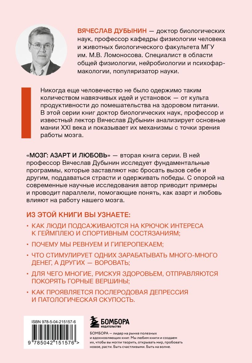 "Smadzenes: kaislība un mīlestība" ir otrā grāmata sērijā. Tajā profesors Vjačeslavs Dubinins pēta fundamentālās programmas, kas mūs mudina izaicināt sevi un citus, ļauties kaislībai un sasniegt uzvaru. Balstoties uz mūsdienu zinātniskajiem pētījumiem, autors sniedz piemērus un velk paralēles, lai palīdzētu mums saprast, kā kaislība un mīlestība ietekmē mūsu smadzeņu darbību.