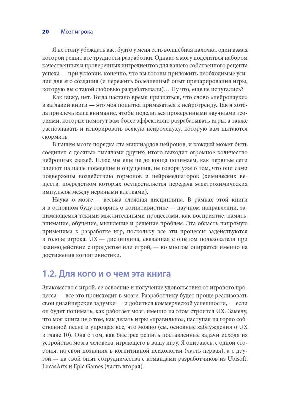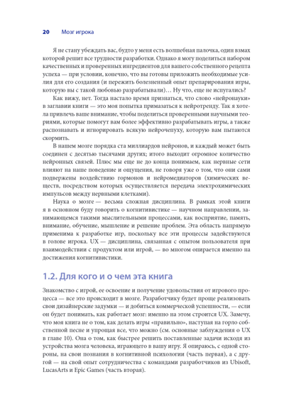 Spēles iepazīšana, tās apgūšana un spēlēšanas baudīšana - tas viss notiek smadzenēs. Izstrādātājam ir vieglāk realizēt savas dizaina idejas un gūt komerciālus panākumus, ja viņš saprot, kā darbojas cilvēka smadzenes: tieši tas ir lietotāja pieredzes (UX) būtība. Ir svarīgi paredzēt, kā spēlētājs uztvers un mijiedarbosies ar jūsu spēli. Izlasot šo grāmatu, jūs uzzināsiet, kuri elementi padara spēli jautru un kuri elementi neļauj cilvēkiem iegremdēties spēlē un izbaudīt to. "Spēlētāja smadzenes" ir praktisks ceļvedis, kas ietver visplašāko pārskatu par UX spēlēs; to var izmantot jebkurš iesācējs vai profesionāls izstrādātājs. Tajā aprakstītie principi ir aizgūti no neirozinātnes - pētījumu jomas, kas pēta, kā mūsu smadzenes uztver, apstrādā un asimilē informāciju. Kopā UX un neirozinātne palīdzēs jums ātrāk atrast gudrākus kompromisus un izdevīgākos spēļu risinājumus, kā arī parādīs, kā nodrošināt auditorijai vislabāko spēļu pieredzi, vienlaikus paliekot uzticīgiem savam dizainam un radošajam nodomam. Sēlija Hodenta ir UX eksperte ar doktora grādu psiholoģijā. Viņa vairāk nekā desmit gadus ir strādājusi izklaides industrijā, tostarp strādājusi tādos pazīstamos uzņēmumos kā Epic Games, Ubisoft un LucasArts.
