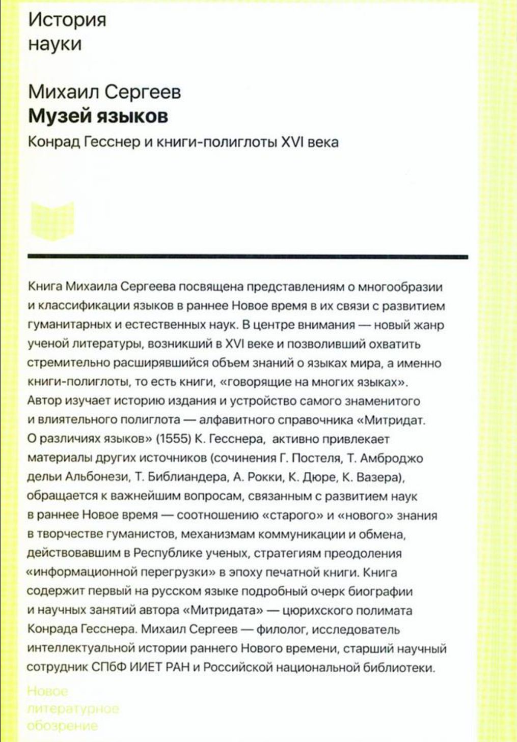 Mihaila Sergejeva grāmata ir veltīta idejām par valodu daudzveidību un klasifikāciju agrīnajā modernajā periodā saistībā ar humanitāro un dabaszinātņu attīstību. Uzmanības centrā ir jauns zinātniskās literatūras žanrs, kas parādījās 16. gadsimtā un ļāva aptvert strauji augošo zināšanu apjomu par pasaules valodām, proti, poliglotu grāmatas, tas ir, grāmatas, kas "runā daudzās valodās".