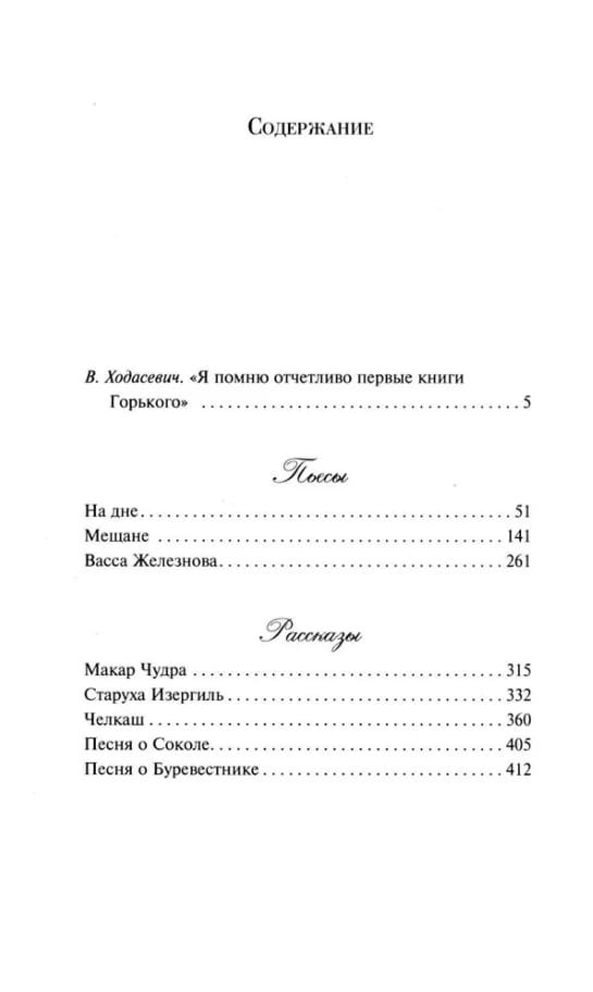 Grāmatā iekļautas arī lugas "Filistieši" un "Vassa Žeļeznova", īsie stāsti "Makars Čudra", "Vecā sieviete Izergila" un "Čelkašs", kā arī prozas dzejoļi "Vanaga dziesma" un "Vētrainā vētrasputna dziesma".