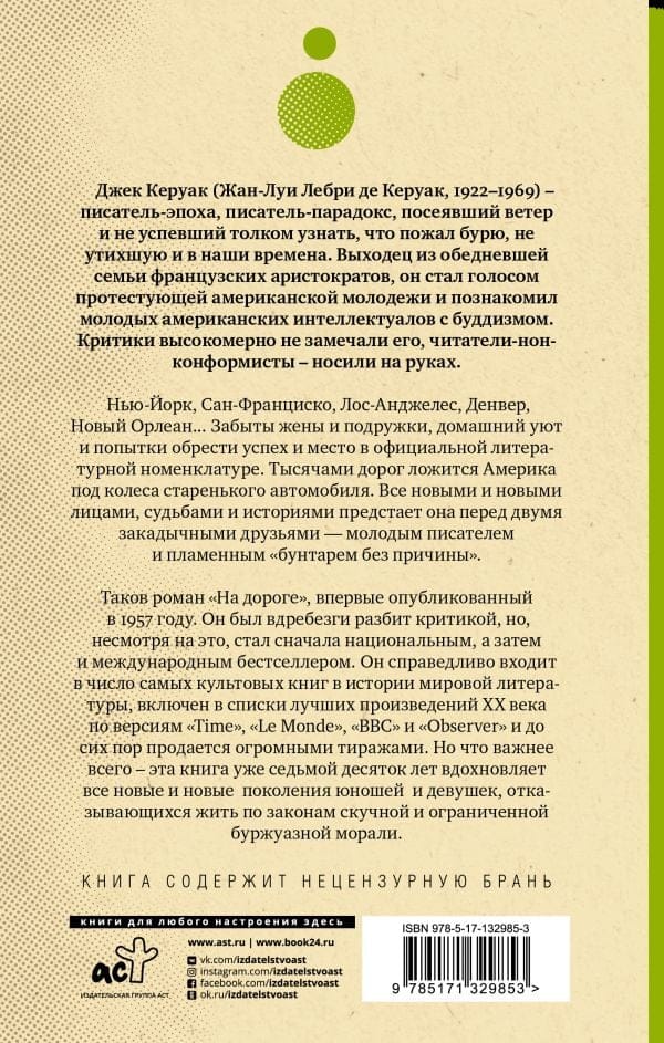 No Ņujorkas līdz Sanfrancisko. No Sanfrancisko uz Losandželosu. No Losandželosas uz Ņūorleānu. No Ņūorleānas? Aizmirstas sievas un draudzenes, mājas ērtības un mēģinājumi gūt panākumus un atrast vietu oficiālajā literārajā nomenklatūrā. Tūkstošiem ceļu Ameriku zem veca auto riteņiem. Visas jaunas un jaunas sejas, likteņi un stāsti, tā paveras divu draugu - jauna rakstnieka un ugunīga "dumpinieka bez iemesla" - priekšā. Tāds ir romāns "Ceļā", kas pirmo reizi publicēts 1957. gadā. Kritiķi to sašūpoja, taču tas tomēr kļuva vispirms par nacionālu un pēc tam starptautisku bestselleru. Tas pamatoti ierindojas starp ikoniskākajām grāmatām pasaules literatūras vēsturē, Time, Le Monde, BBC un Observer to ir iekļāvuši 20. gadsimta labāko darbu sarakstos, un joprojām tiek pārdots milzīgos tirāžos. Taču vissvarīgākais ir tas, ka šī grāmata jau septīto desmitgadi iedvesmo jaunas jauno vīriešu un sieviešu paaudzes, kas atsakās dzīvot pēc garlaicīgas un ierobežotas buržuāziskās morāles likumiem.