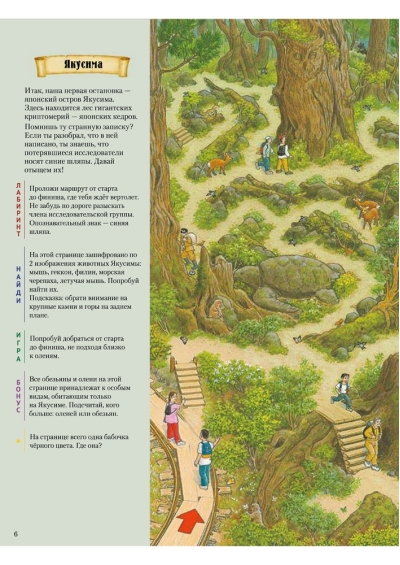 Atrast izeju no labirinta ir izaicinājums drosmīgākajiem, uzmanīgākajiem un pacietīgākajiem. Nav viegli izsekot līkumotajam ceļam starp bieziem biezokņiem un eksotiskiem dzīvniekiem! Šī grāmata būs lielisks sabiedrotais garā ceļojumā, tā atsvaidzinās gaidīšanas laiku un palīdzēs pavadīt ne vienu vien vakaru. Ne visas grāmatā apslēptās slepenās zīmes jums atklāsies no pirmā acu uzmetiena! Izmantojiet savu iztēli - tikai tā jūs varēsiet tās saskatīt un atšķetināt dabas noslēpumus. Lai atrastu pareizo risinājumu, tev nāksies piepūlēt prātu, tāpēc, aplūkojot ilustrācijas, tu uzzināsi daudz jauna par apkārtējo pasauli. Ceļojot pa kontinentiem, tu iepazīsies ar dzīvniekiem, kas dzīvo uz sauszemes un okeānā, ieraudzīsi unikālus dabas pieminekļus... Šādu grāmatu nedrīkst palaist garām! Tās autors - japāņu mākslinieks Gentaro Kagawa (dzimis 1959. gadā) ilustrē vēsturiskus žurnālus, mācību grāmatas un grāmatas par arhitektūru, raksta ainavas. Viņa gleznas rotā Japānas pastmarku un pastkaršu sērijas. Lai radītu grāmatu "Uz sauszemes un okeānā. Labirinti" viņam palīdzēja cilvēki, kuri par mūsu planētu zina visu vai gandrīz visu: zoodārza "Inokašira" vadītājs Etsuo Narušima, Japānas pārstāvis Starptautiskajā arahnologu biedrībā Hirotsugu Ono un Valsts Zinātņu muzeja goda darbinieks Masatsune Takeda. Pateicoties viņu rūpīgajam darbam, grāmata ir kļuvusi par īstu savvaļas dzīvnieku enciklopēdiju.