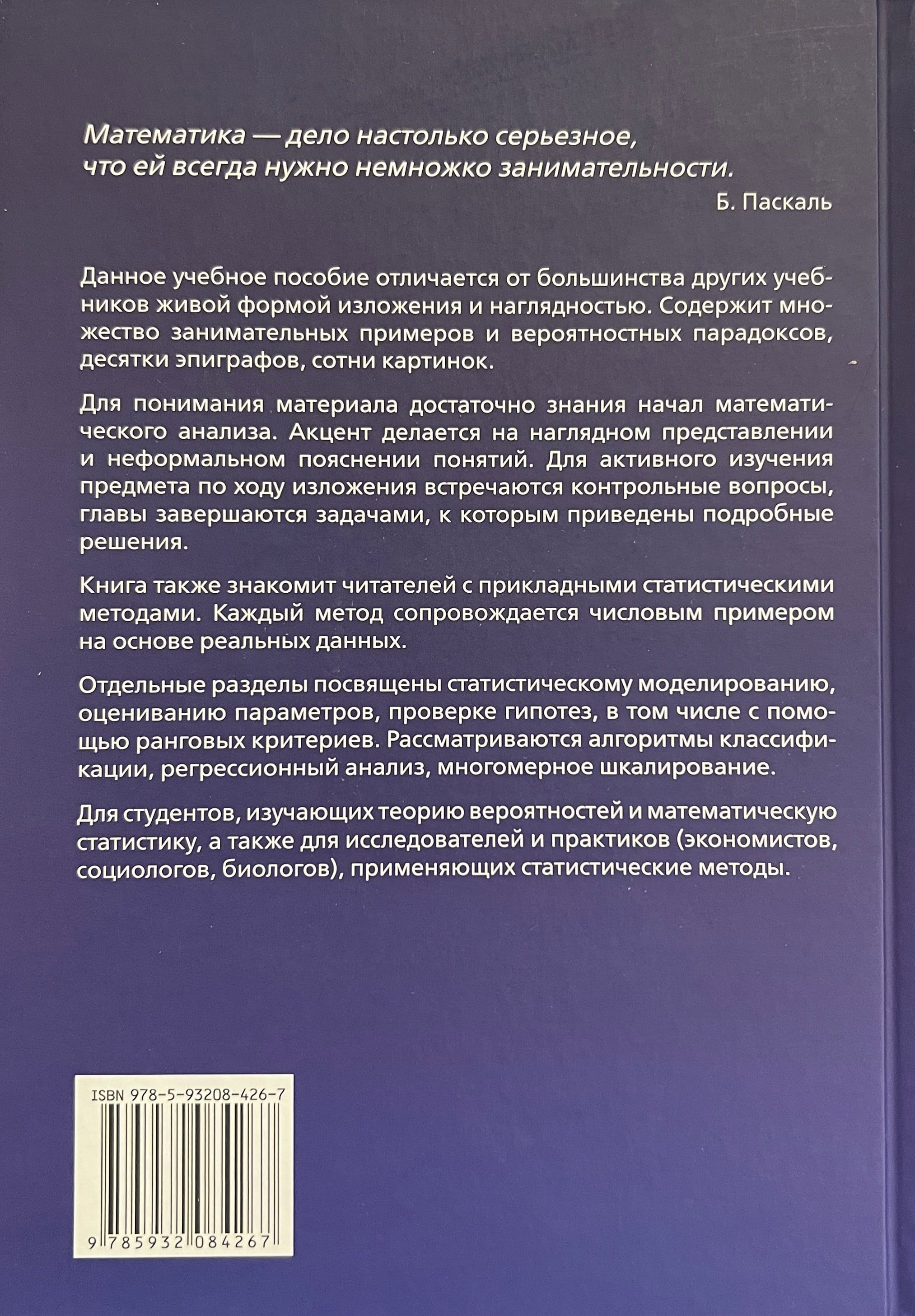 Varbūtību teorijas un matemātiskās statistikas pamati tiek parādīti, izmantojot piemērus un uzdevumus ar risinājumiem. Grāmata iepazīstina lasītāju arī ar lietišķajām statistikas metodēm. Lai izprastu materiālu, pietiek ar matemātiskās analīzes pamatzināšanām. Iekļauts liels skaits attēlu, viktorīnu un skaitlisku piemēru.