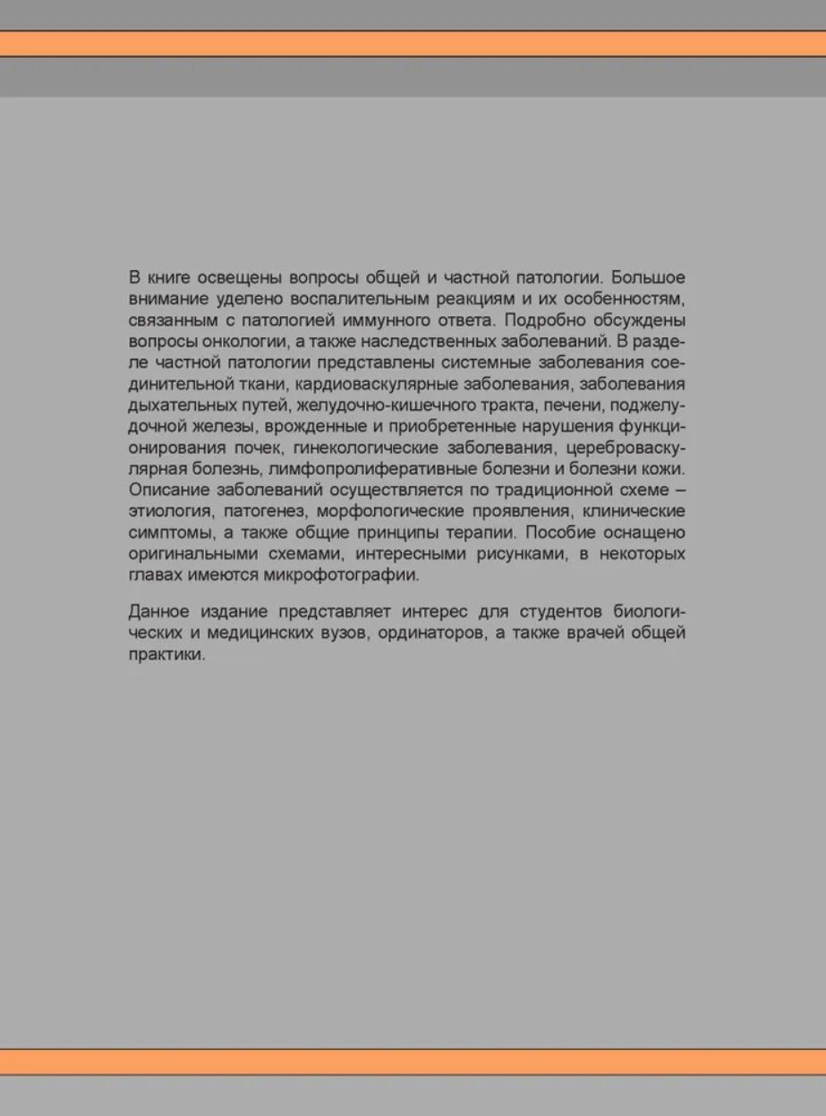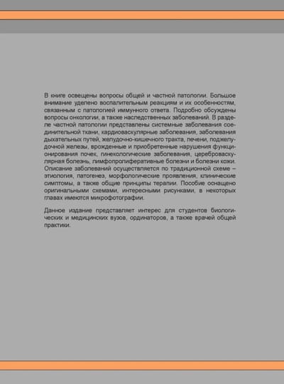 Galvenā informācija par vairuma slimību epidemioloģiju, patogenezi un klīniskajiem simptomiem ir sniegta lietotājam draudzīgā formātā ar daudzām saistošām, viegli iegaumējamām ilustrācijām. Īpaša uzmanība tiek pievērsta iekaisuma reakcijām un to īpašībām, kas saistītas ar imūnsistēmas disfunkciju. Grāmata ir sadalīta trīs sadaļās: patoloģijas pamati, sistēmiskā patoloģija un klīnisko gadījumu piemēri. Ir iekļauts arī pašnovērtējuma materiāls.