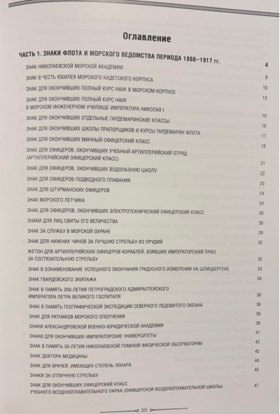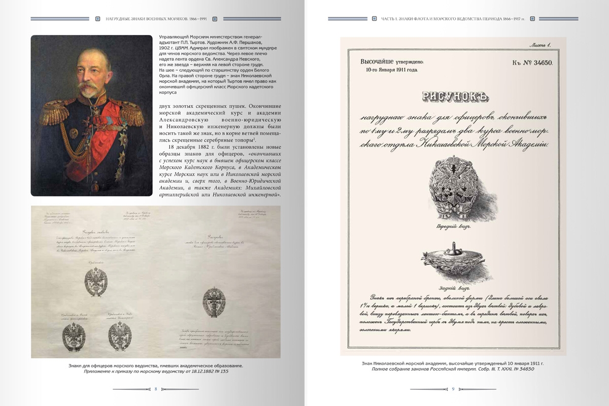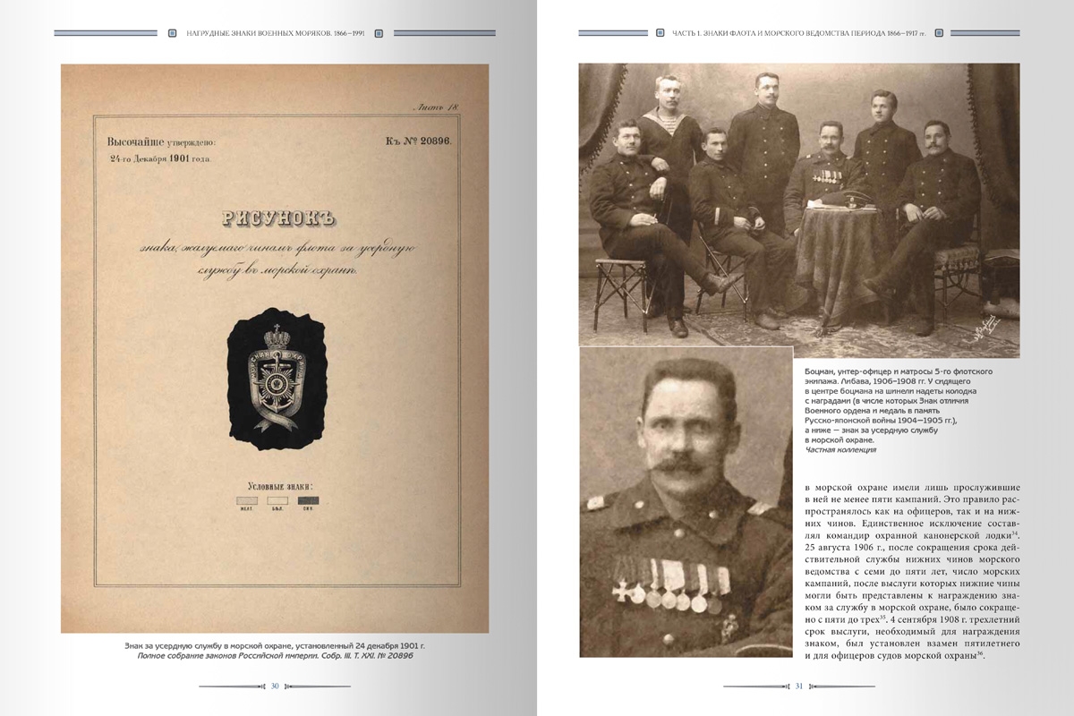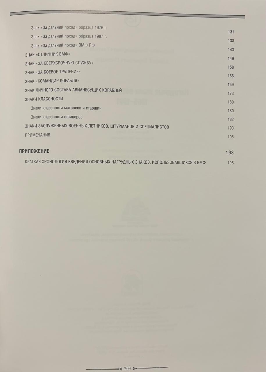 Šī grāmata ir veltīta Krievijas un Padomju Savienības jūras spēku karavīru valkātajām nozīmītēm no 19. gadsimta otrās puses līdz 20. gadsimta beigām. Tajā aprakstītas izglītības iestāžu, dažādu specializēto skolu un kursu nozīmītes, kvalifikācijas zīmes, apbalvojumu zīmes, kā arī piemiņas zīmes un daži žetoni. Grāmata balstīta uz arhīvu dokumentiem, noteikumiem un autentiskiem ieročiem, kas glabājas valsts muzejos un privātkolekcijās. Katrai zīmei ir iekļauta hronoloģija, īss apraksts un galveno tās veidu saraksts. Grāmata ir ilustrēta ar vēsturiskiem zīmējumiem, rasējumiem, skicēm un fotogrāfijām, kā arī nozīmīšu un ar tām apbalvoto karavīru fotogrāfijām no muzeju un privātkolekcijām. Ievērojama daļa ilustrāciju tiek publicētas pirmo reizi.