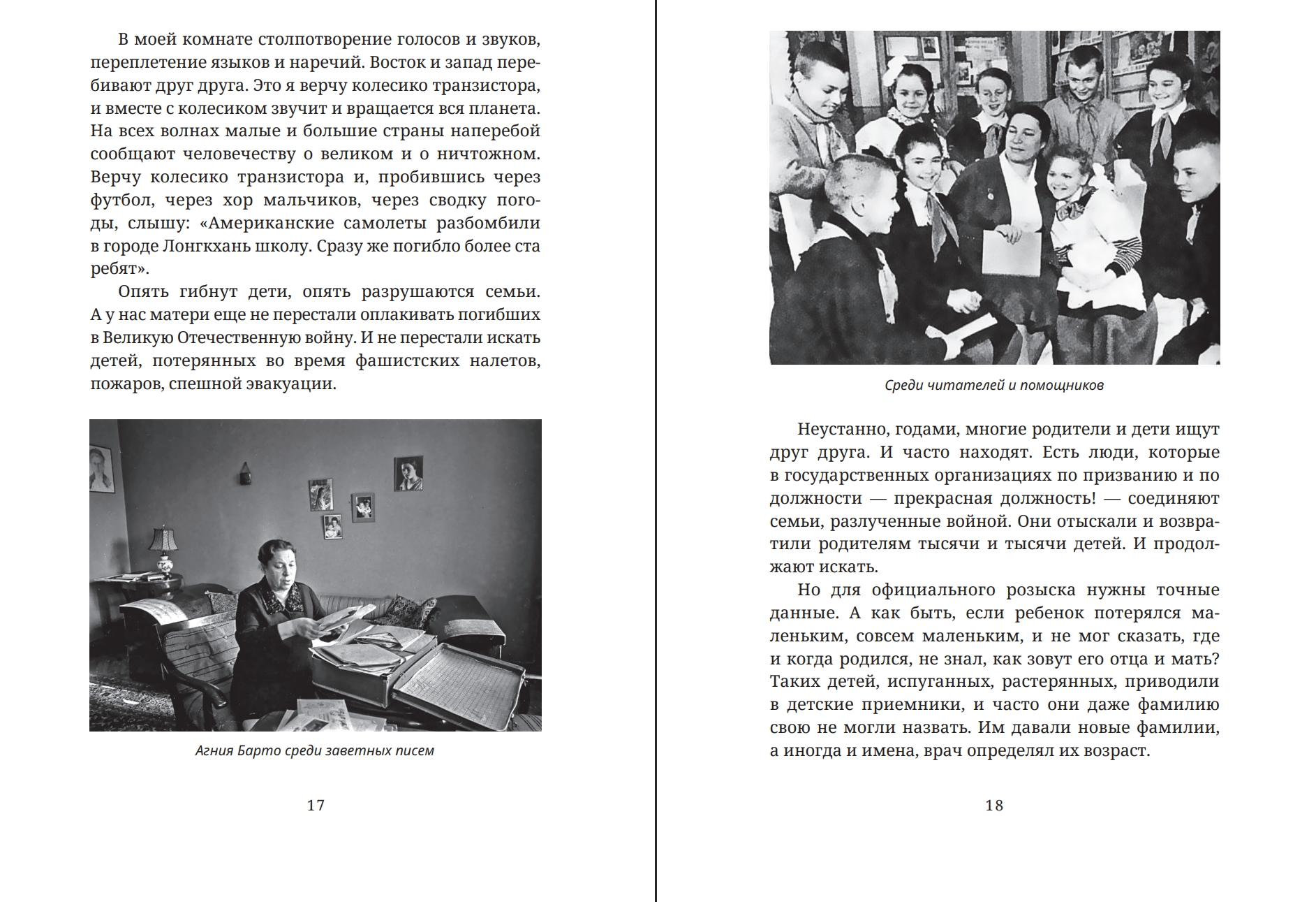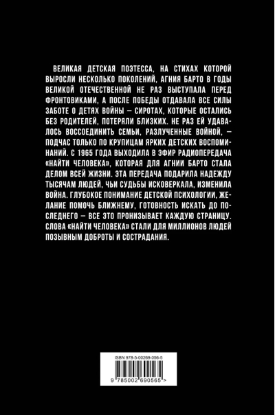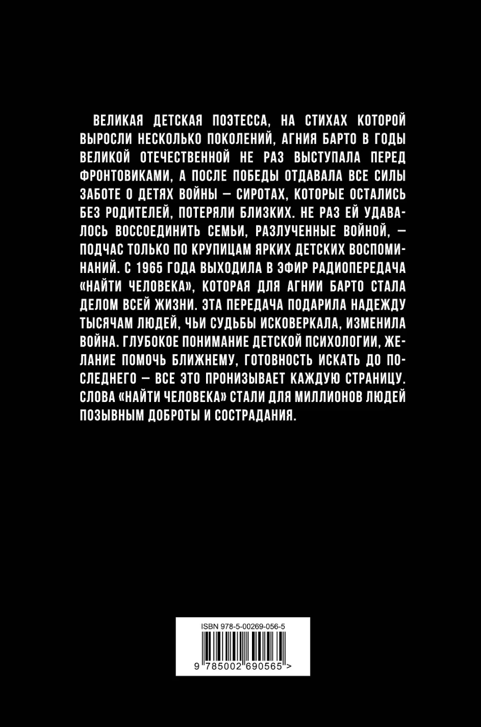 Agnija Barto, lieliska bērnu dzejniece, ar kuras dzejoļiem uzaugušas vairākas paaudzes, Lielā Tēvijas kara laikā neskaitāmas reizes uzstājās frontes karavīriem, un pēc Uzvaras dienas viņa pilnībā veltīja sevi kara bērnu – bāreņu un ievainoto dzīvnieku, kuri bija zaudējuši vecākus un tuviniekus, aprūpei. Viņa atkārtoti apvienoja kara šķirtas ģimenes, dažreiz tikai ar spilgtu bērnības atmiņu fragmentu palīdzību. Kopš 1965. gada radio tiek pārraidīta programma "Atrodi cilvēku", kas kļūst par Agnijas Barto mūža darbu. Šī programma ir devusi cerību tūkstošiem cilvēku, kuru dzīves karš ir sagrozījis un mainījis.