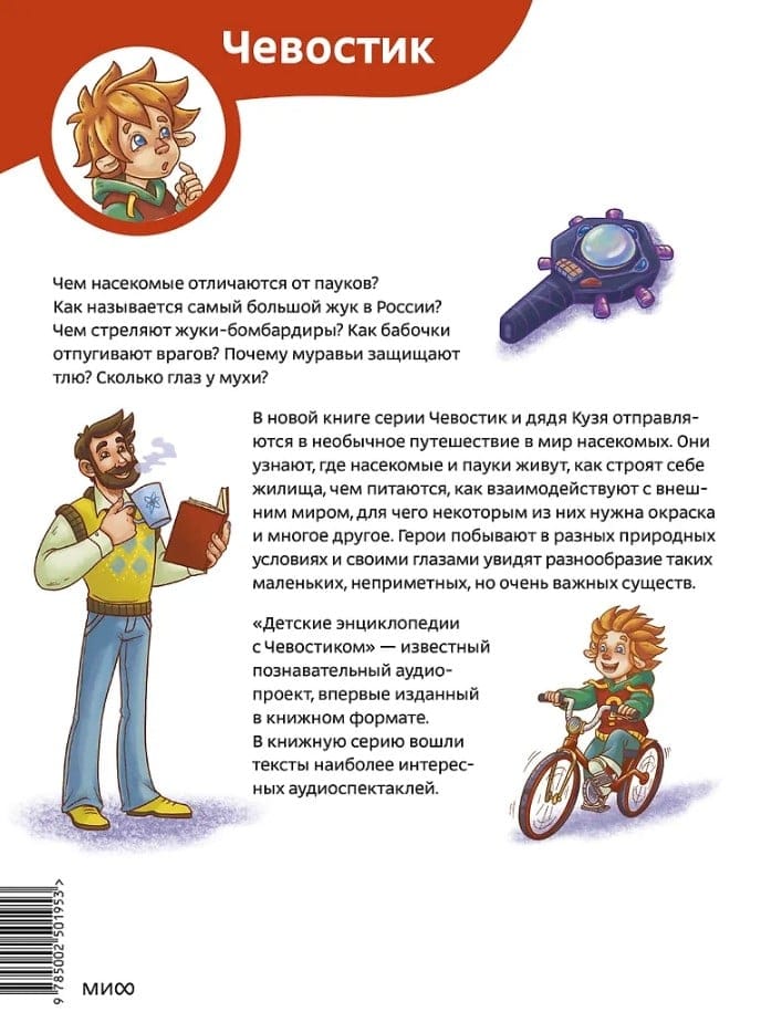 Grāmatā ir vairāk nekā 20 sīku radību sugas, spilgtas ilustrācijas un neparasti fakti, kas pārsteigs gan bērnus, gan pieaugušos. Vairs nav jābaidās no zumējošas bites vai veiklā zirnekļa — katrs no tiem rūpējas par mūsu planētu savā veidā. Čevostiks ir iemīļots tēls enciklopēdijās un audio projektos, padarot pasaules iepazīšanu patiesi interesantu un vienkāršu. Bērniem, kuriem jau ir šīs sērijas grāmatas, viņš patiks.