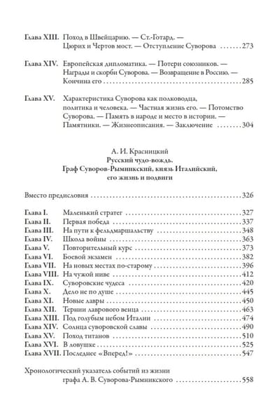 Krājums turpinās ar diviem Suvorovam veltītiem biogrāfiskiem romāniem, kuru autori ir Nikolajs Aleksejevičs Poļevojs (1796–1846): "Itālijas kņaza, grāfa Suvorova-Rimņikska, Krievijas karaspēka ģenerālisimo, vēsture" (1843) un Aleksandrs Ivanovičs Krasņickis (1866–1917): "Krievijas brīnumvadonis: grāfs Suvorovs-Rimņikskis, Itālijas kņazs, viņa dzīve un varoņdarbi" (1910). Krājums noslēdzas ar Vasilija Aleksejeviča Aleksejeva (1863–1919) pētījumu "Suvorovs dzejnieks" (1901).