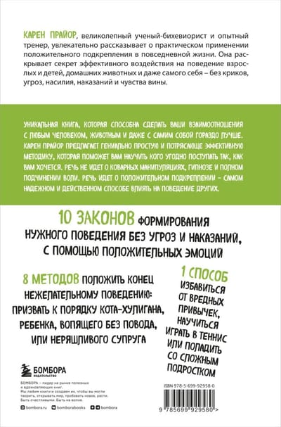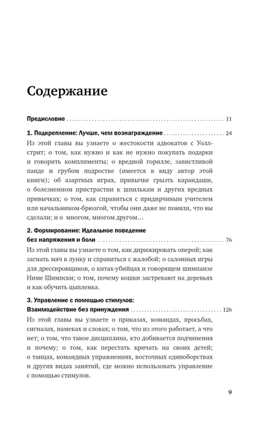 Karena Prjora piedāvā ģeniāli vienkāršu un efektīvu metodiku, kas palīdzēs jums iemācīt ikvienam darīt to, ko vēlaties, lai viņš dara. Runa nav par viltīgām manipulācijām, hipnozi un pilnīgu gribas pakļaušanu. Runa ir par pozitīvu pastiprināšanu - visdrošāko un efektīvāko veidu, kā ietekmēt citu cilvēku uzvedību. Jūs uzzināsiet, kā panākt, lai jūsu dzīvesbiedrs reizi par visām reizēm pārtrauktu ņirgāties; kā iemācīt savam trīsgadniekam uzvesties; kā izskaidrot savam kaķim, lai viņš nelien uz virtuves galda; kā panākt, lai jūsu priekšnieks regulāri paaugstina jums algu; kā uzlabot savu sniegumu visdažādākajās jomās, sākot no sporta līdz dzejas rakstīšanai; vai kā ar pozitīva pastiprinājuma palīdzību lauzt sliktus ieradumus.