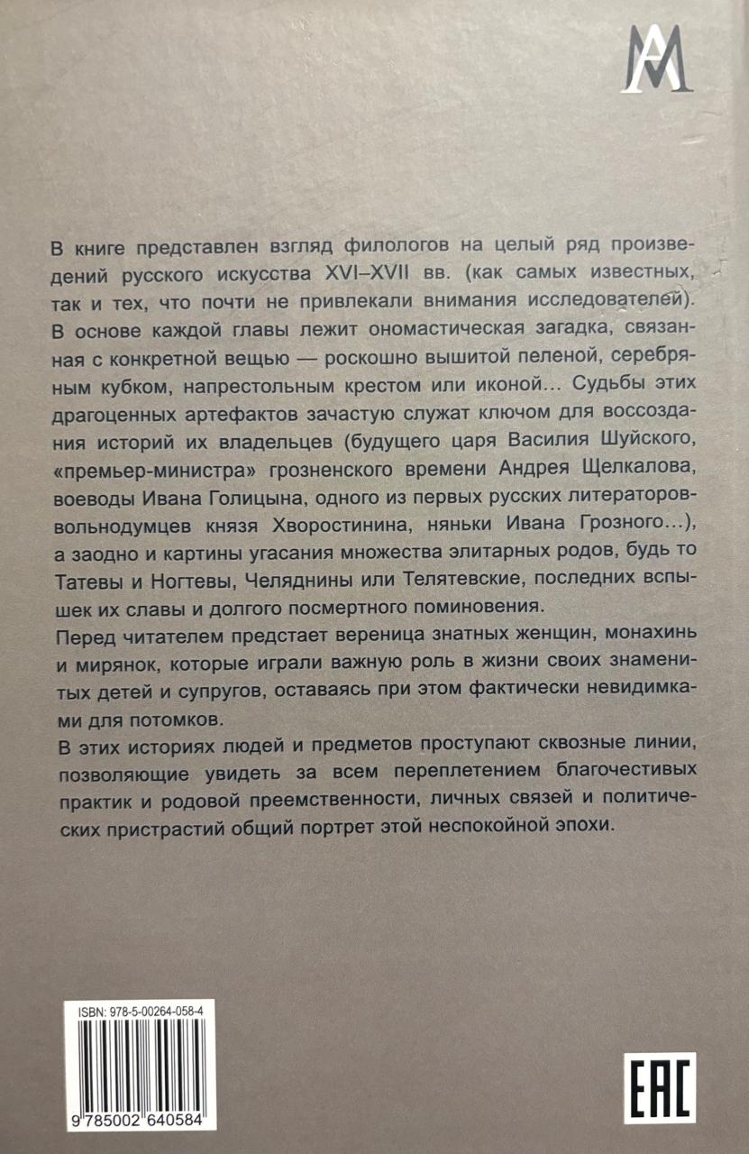 Grāmatā ir sniegts filologu skatījums uz plašu 16. un 17. gadsimta krievu mākslas darbu klāstu (gan slavenākajiem, gan tiem, kas ir guvuši maz zinātnieku uzmanības). Katra nodaļa ir balstīta uz onomastisku mīklu, kas saistīta ar konkrētu priekšmetu — grezni izšūtu līķautu, sudraba kausu, altāra krustu vai ikonu. Šo dārgo artefaktu likteņi bieži vien kalpo kā atslēga to īpašnieku stāstu rekonstrukcijai (topošais cars Vasilijs Šuiskis, Groznijas laika "premjerministrs", Andrejs Ščelkalovs, vojevods Ivans Golicins, viens no pirmajiem krievu brīvdomīgajiem rakstniekiem, kņazs Hvorostinins, Ivana Bargā aukle...), kā arī daudzu elites ģimeņu norietu attēli, vai tie būtu Tatevi un Nogtevi, Čeļadņini vai Teļatevski, viņu pēdējie slavas uzplaiksnījumi un ilgā pēcnāves piemiņa.